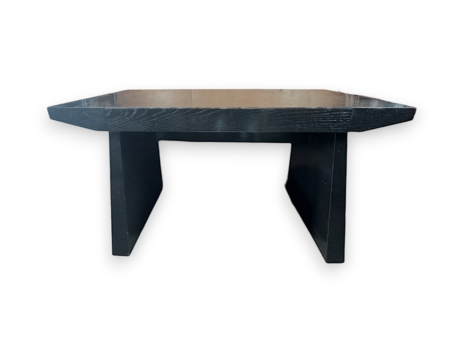 Vintage Wood Veneer Pagoda Desk w/Hideaway Drawer Measures 56"L x 28"D x 30.25"T Solid wood mixed with composite wood covered in wood veneer - has been painted black Missing edges near drawer. Drawer pulls out and closes flush hiding it away - needs new magnets to keep shut Bidding on this lot is an agreement that: (1.) You
