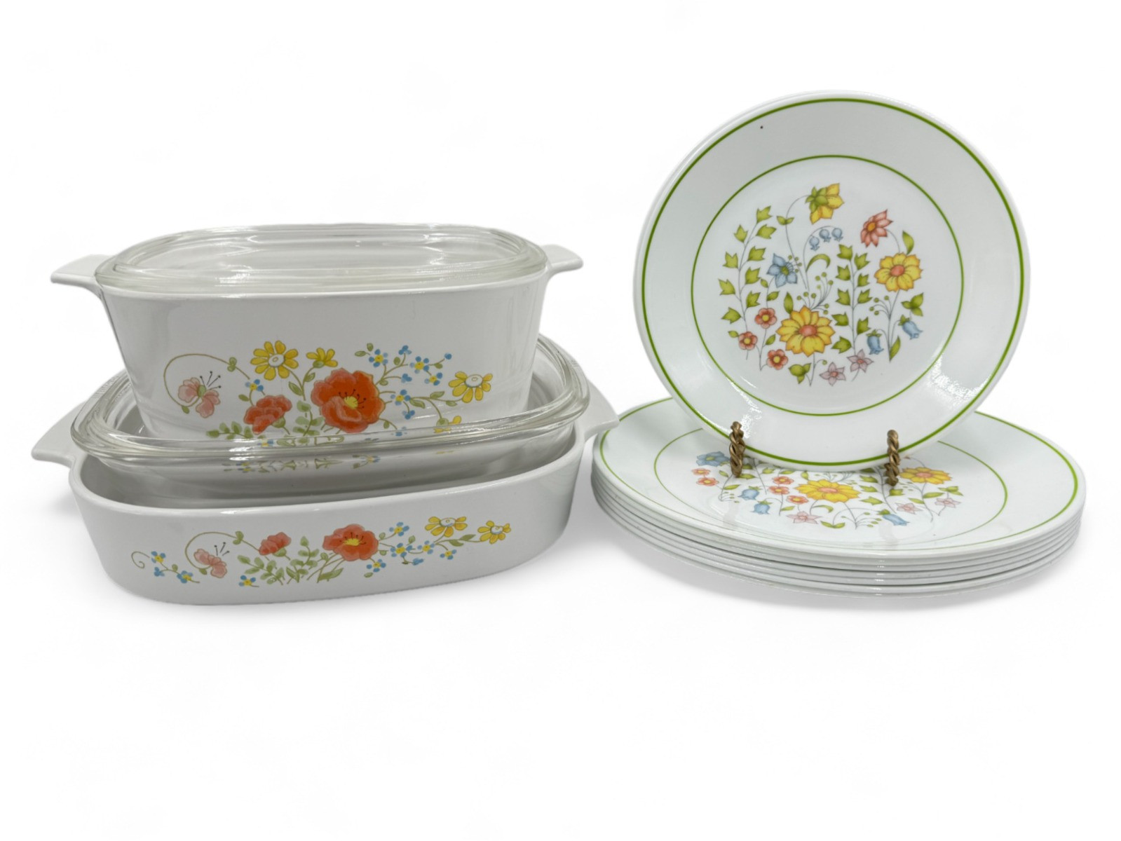 Corning Ware Wildflower Casserole Baking Dishes with lids - 3qt & 10x10x2 10x10x2 lid has flea bite to the rim Corelle Meadow: (7) 10.25"D Dinner plates (2) 8.5"D Luncheon plates Only flaw is the noted glass lid flea bite