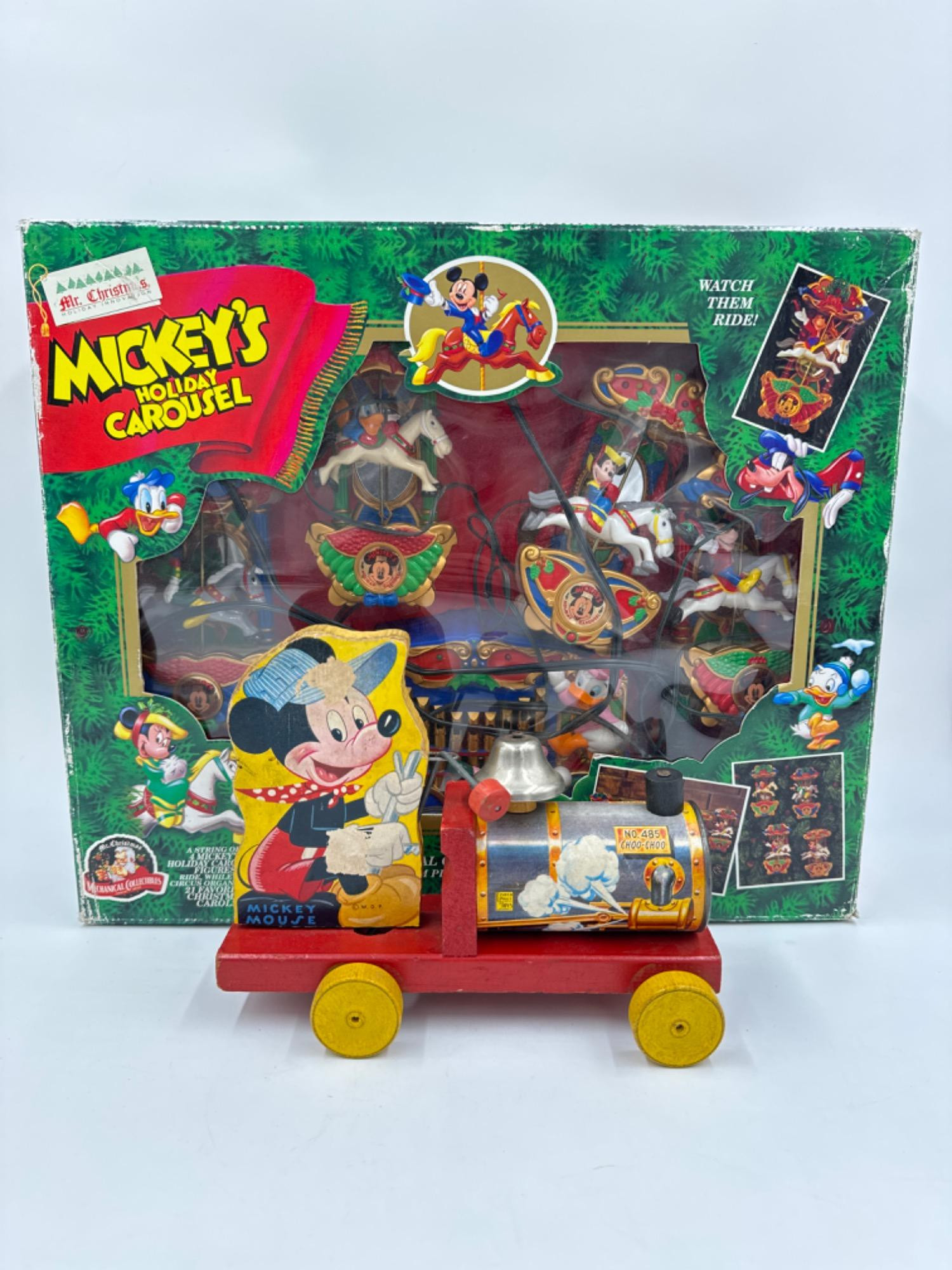 1993 Mr. Christmas Mickey Carousel - untested 1940s Fisher Price Wood Mickey Pull Train - damage to paper - 8.5"L