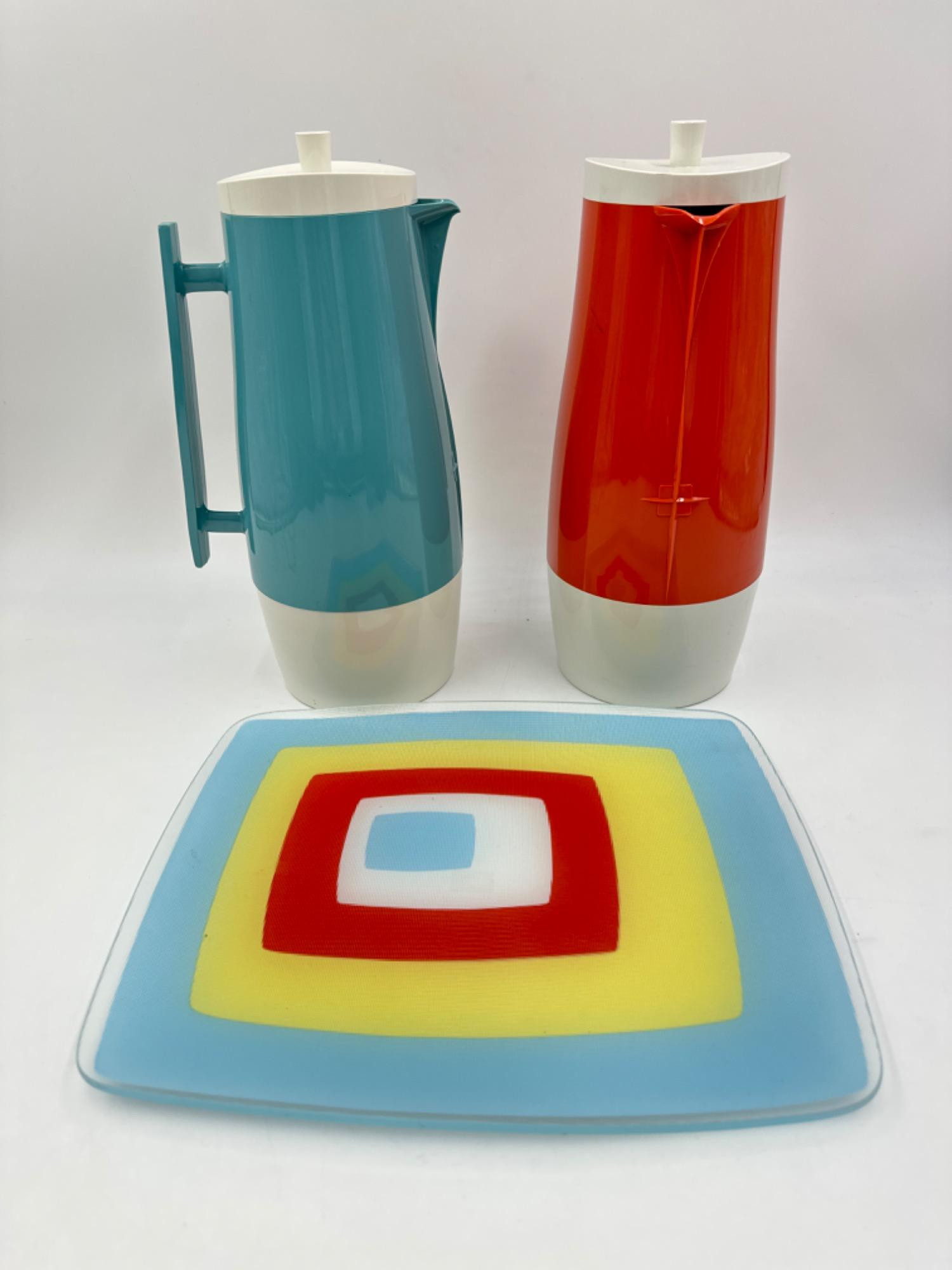 Atomic Retro Aladdin's Beverage Butler Blue & Rust Thermos Pitchers + Glass tray - 11.25 x 9.5” Vintage 11.75”T Aladdin’s Beverage Butlers - EXCELLENT condition