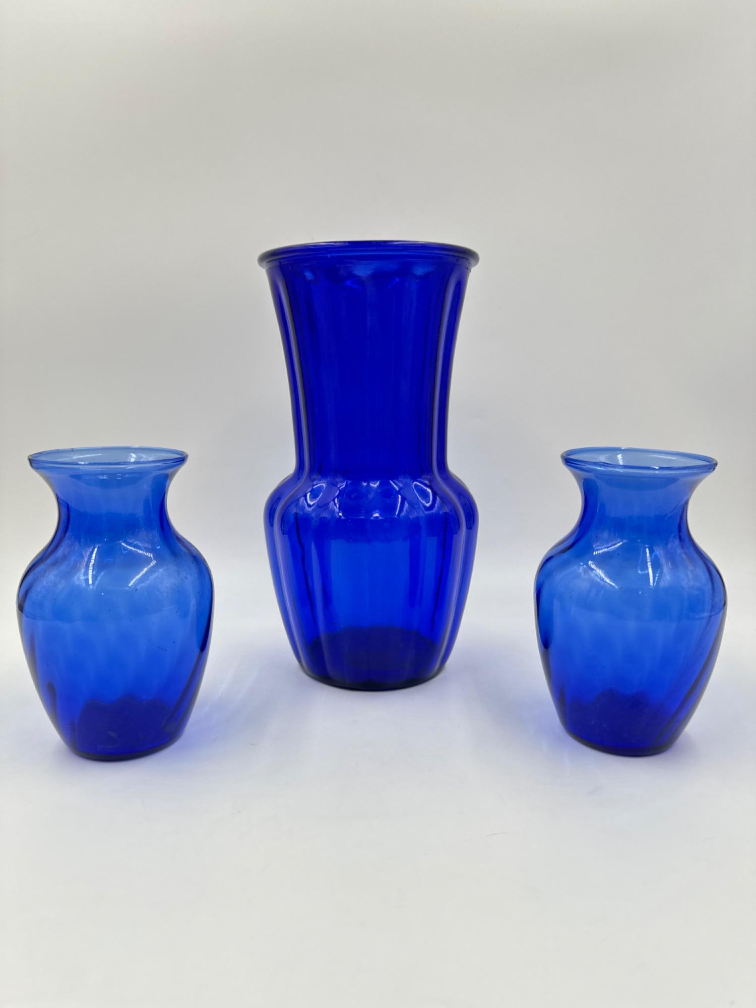 Vintage Cobalt Blue Indiana Glass Vase Trio - Hand Blown 10 inch and (2) 5.5 inch All in great condition