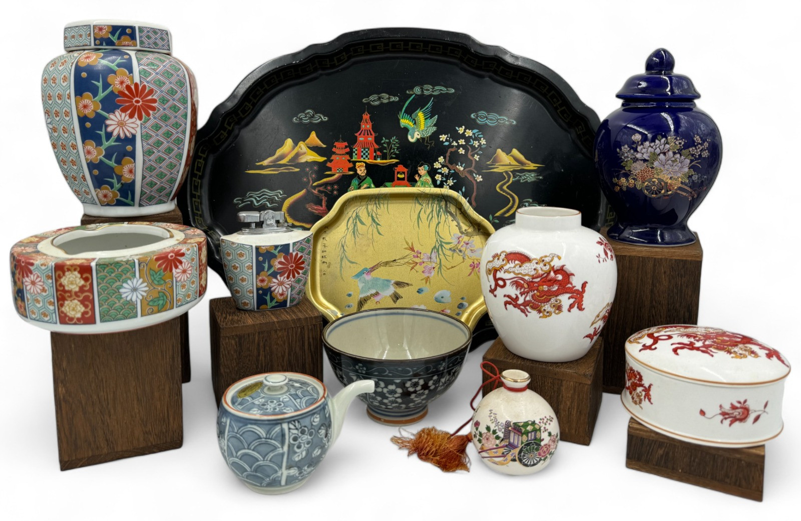 Crown Staffordshire China 'Rangoon' ginger jar - no lid Crown Staffordshire China 'Rangoon' lidded trinket dish Arita Fan Imari Pattern Ashtray, Lighter, and Ginger Jar Measures b/w 2.5 - 6.5”T 17.5” tray All appear to be in great condition