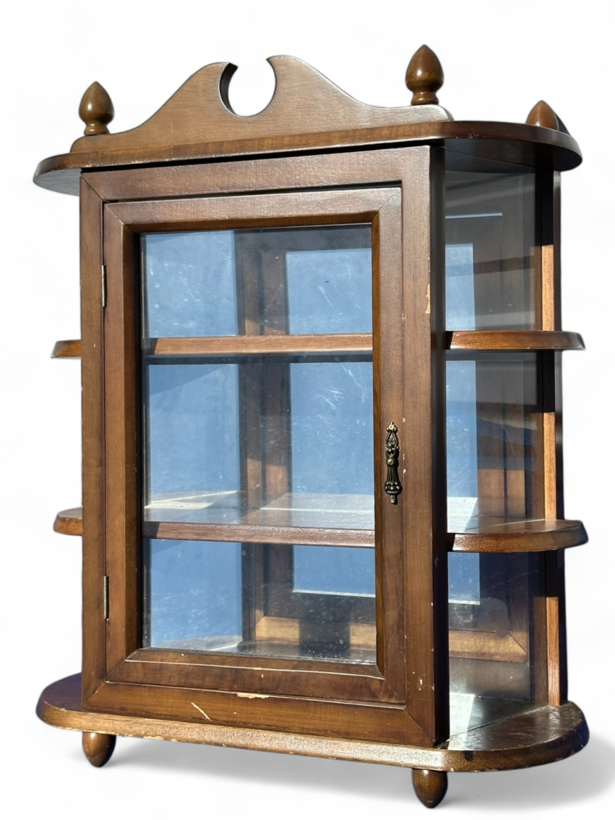 Vintage Mirror Back Wood & Glass Curio Cabinet - Tabletop or Wall Wood with veneer finish. Glass sides and front, mirror in great condition Measures: 20"L x 24"T x 8.25"D Veneer has wear.