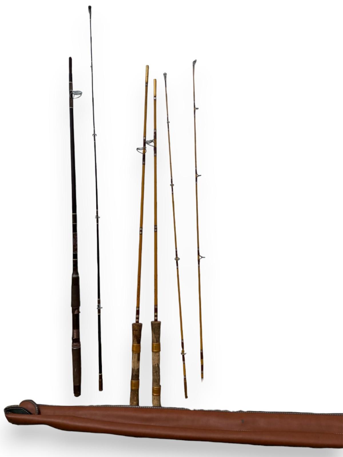 Vintage Berkley Parametric Curt Gowdy Signature Fishing Rod 7' + 2 Bamboo Poles Two Bamboo poles - one signed George Daring & the second signed Mickey Daring Each segment of the bamboo poles is 40 inches Berkley Parametric Curt Gowdy Signature 7' with leather carry case