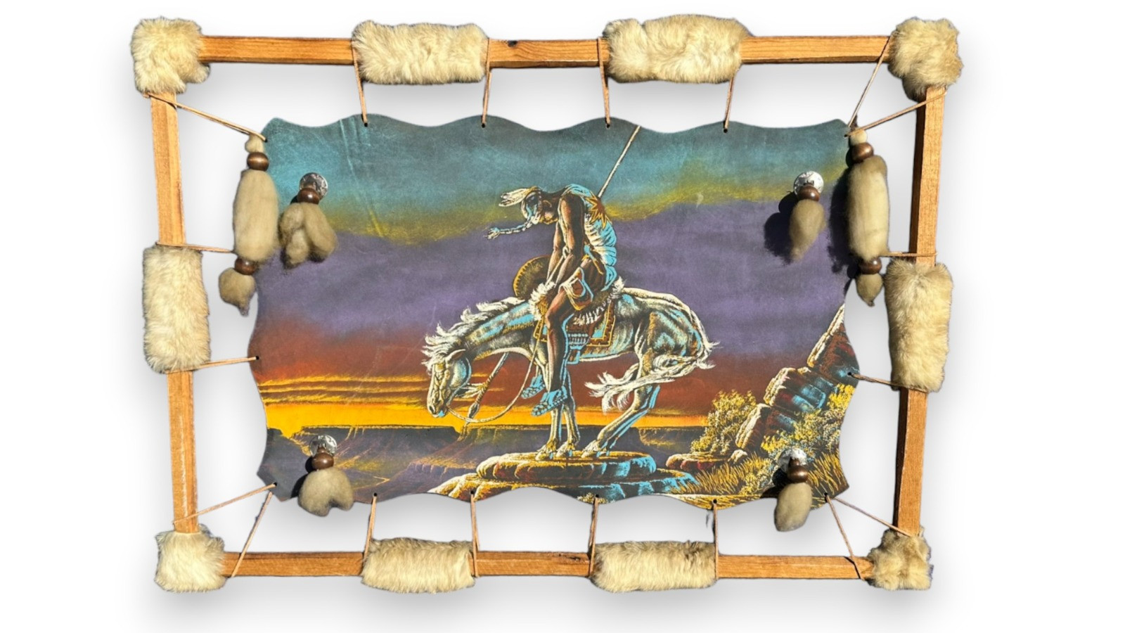 Vintage “End of the Trail” Painted on Hide Art Animal fur and wool adorned frame - 41“ x 29“