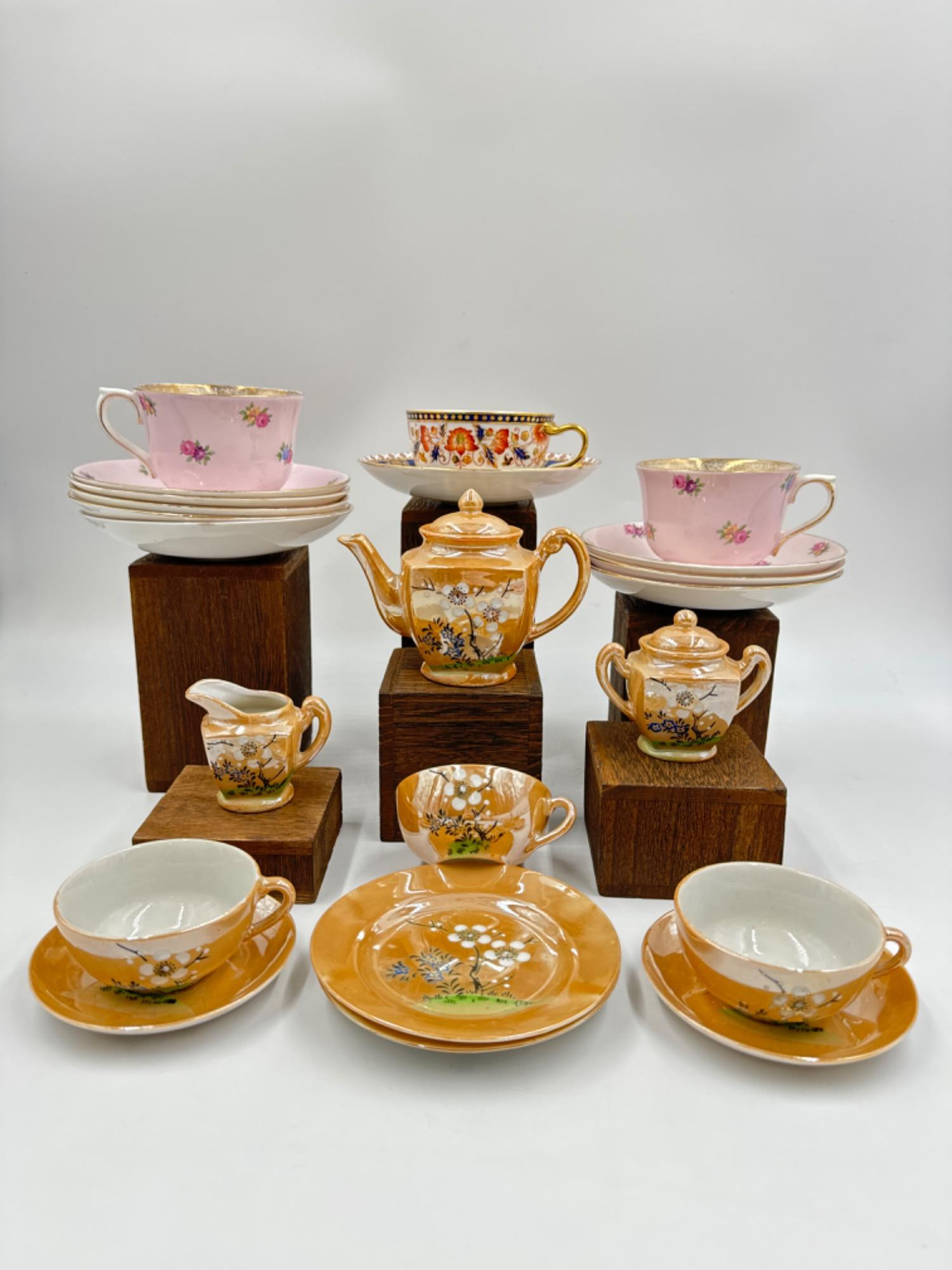 Peach Lustre Mini Tea Set Colclough Pink Teacups and Saucers - One cup has crack through handle Wedgwood cup (discolorations) & Colclough Saucer All items are in good condition with the exceptions noted above