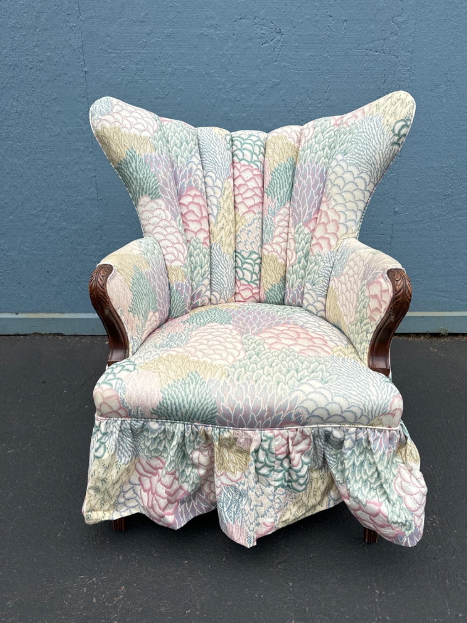 Vintage 1970s Meets 1990s Wingback Arm Chair Fabric needs a refresh Structurally sound 31" at widest x 33"T x armrest is 26" apart x seat height 16"