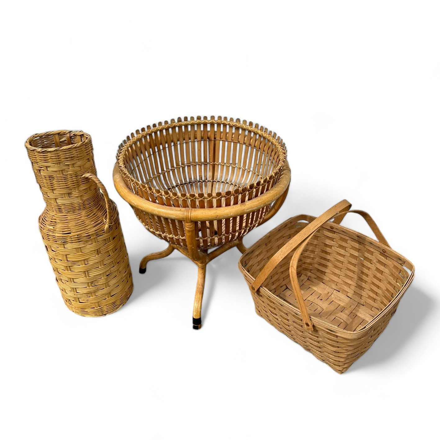 1960s Franco Albini Style Rattan Fishing Basket Table Base - 22"D x 21"T EXCELLENT condition - needs round glass top to complete table Woven square basket 16"L x 15"W x 10"D Cylindrical handled basket is 24"T x 9"D at base x 6"D at neck All appear to be in great condition