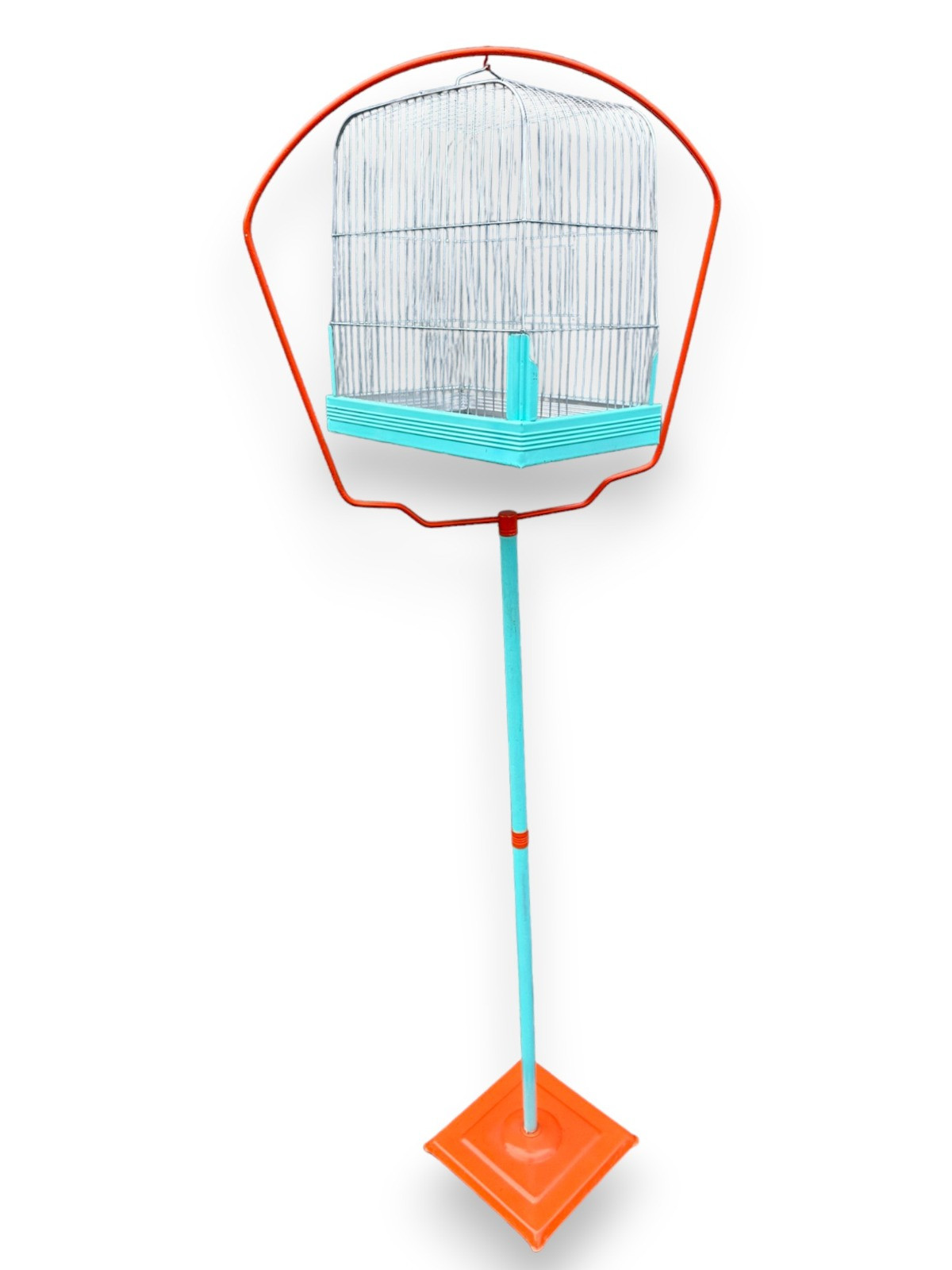 Mid Century Metal Hendryx Bird Cage on Stand Stand is 65"T x overall 21"W x base is 10.5"W Cage is 14"W x 9"D x 14"T The bottom is removable. Painted in modern atomic orange and blue.