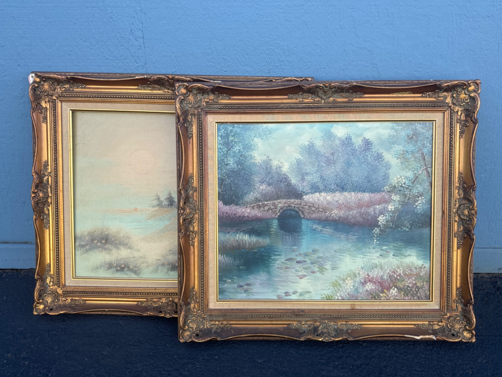 Vintage Impressionist Landscape Painting in Ornate Frame Both ornate frames have damage. Pairing the 2 frames together so that hopefully one could be fully repaired. Impressionist painting is in lovely condition. Frames measure: 28" x 32"