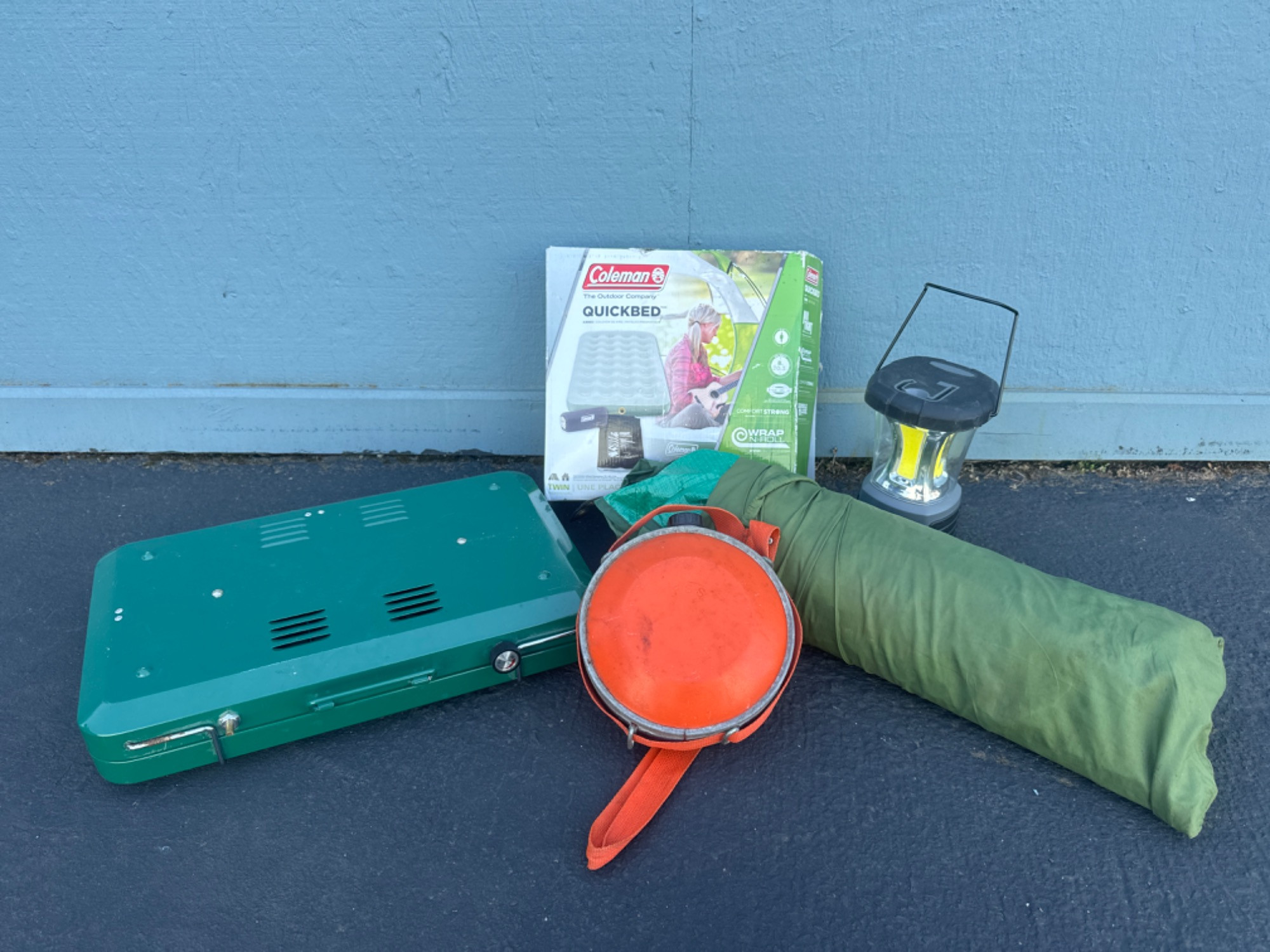 Camping Lot US Forest Service Canteen, Propane Stove - untested NIB Coleman Twin Quickbed Tent - unknown condition LED Lantern - untested