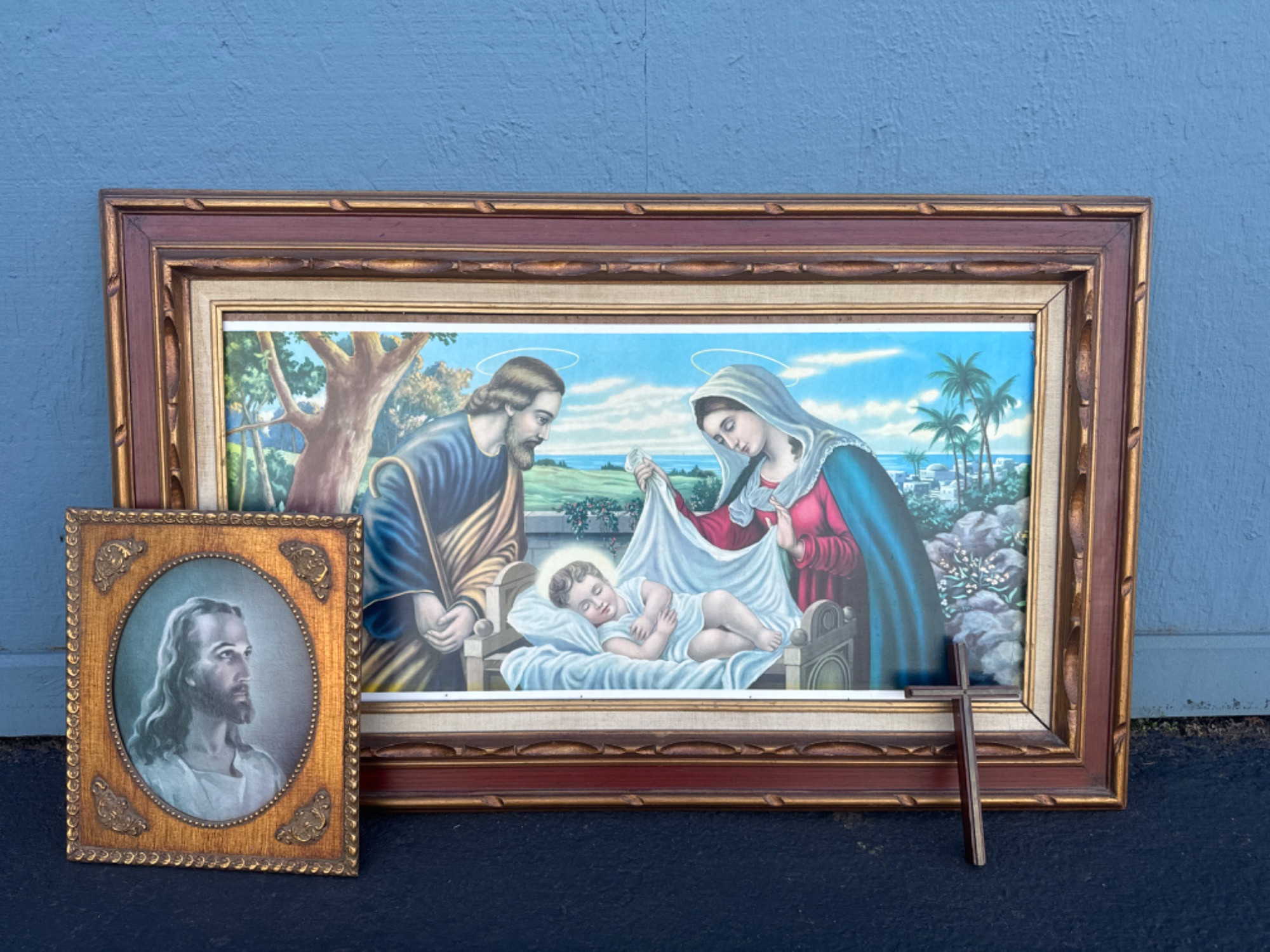 Made in Italy SACRA FAMIGLIA/Sacred Family Art Print- 23"T x 37.5"W - damage to frame and print Head of Christ in ornate frame - 10.75" x 13"T