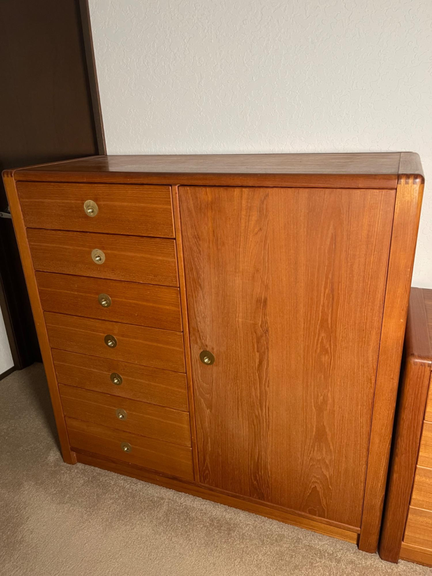 Mid Century D-Scan "Captain" Teak Wardrobe. Bring home genuine mid-century modern design with this tremendous gentleman's chest from D-Scan's iconic "Captain" series. Showcasing a broad, rich teak grain, round brass campaign pulls, and rounded corner box joints this is sure to be the centerpiece of any room. With seven sizable pull-out drawers and an ample three-shelf cabinet, this may be the last storage solution you'll ever need! Chest measures- 48.5 L x 19.5 D x 47" Tall