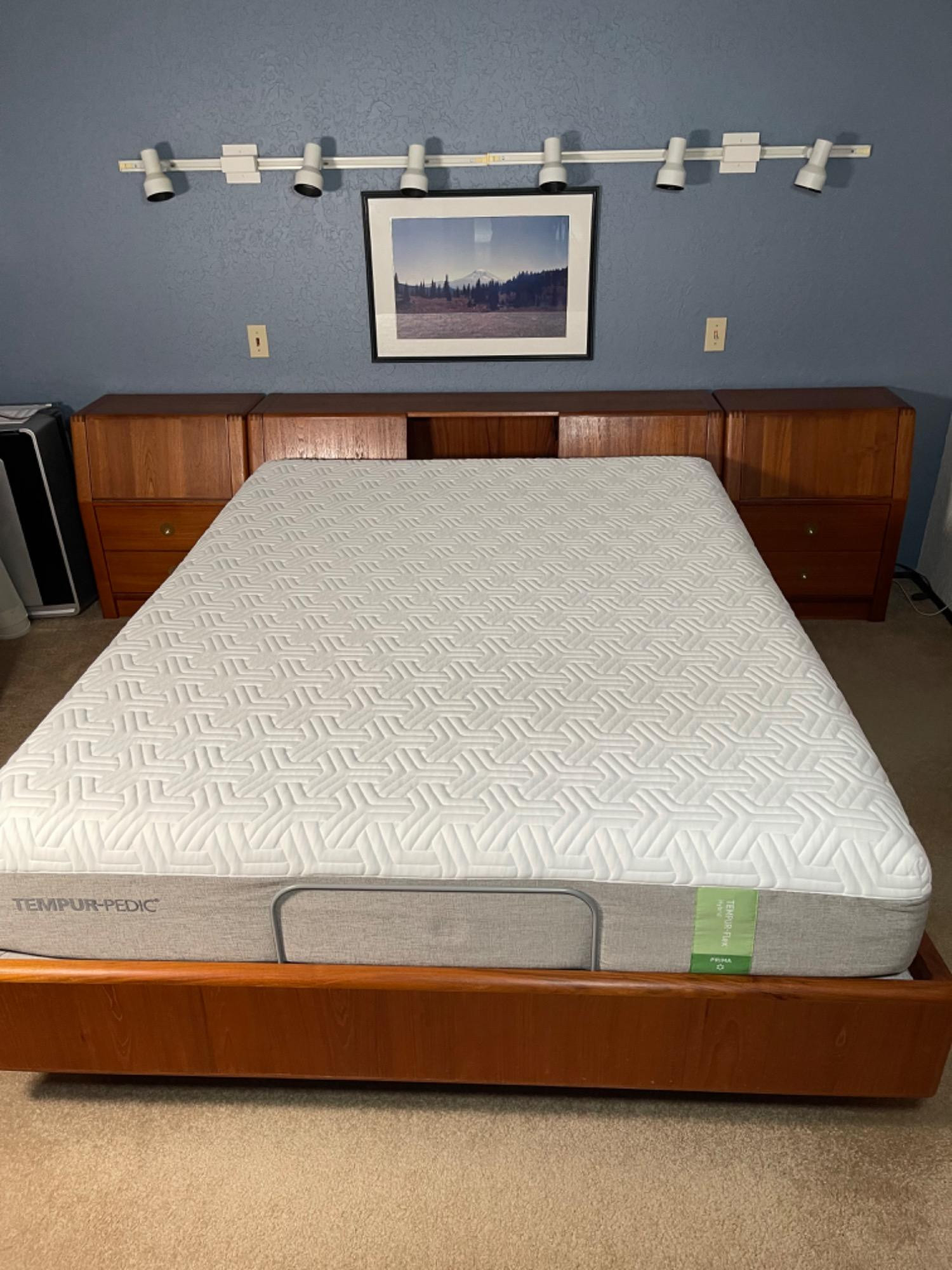 Teak Bed With Tempur-Flex Hybrid Mattress- Electronic Head/Foot D-Scan Danish Modern Queen Teak Captain Line Storage Platform Bed Frame. Pair of D-Scan Captain Line Pair of Danish Modern Style Teak Nightstands Bedside Tables. Each measure-24 W x 14W x 29T D-scan Danish Modern queen teak captain line storage platform bed. Item includes (2) drop down storage cabinets, 2 bolster pillows, outlets to rear, finger joinery, beautiful wood grain, original labels, 2 drawers, clean modernist lines, circa late 20th century. Measurements: Overall: 29.5" H x 63.5" W x 96.5" D. Footboard: 16" H. Interior: 60" W x 80" D. Bed-96 L x 60 w x 25 T Headboard- 63L x 14 W x 29 Tall A few drink rings on top but otherwise in good shape. (Easily buffed out)