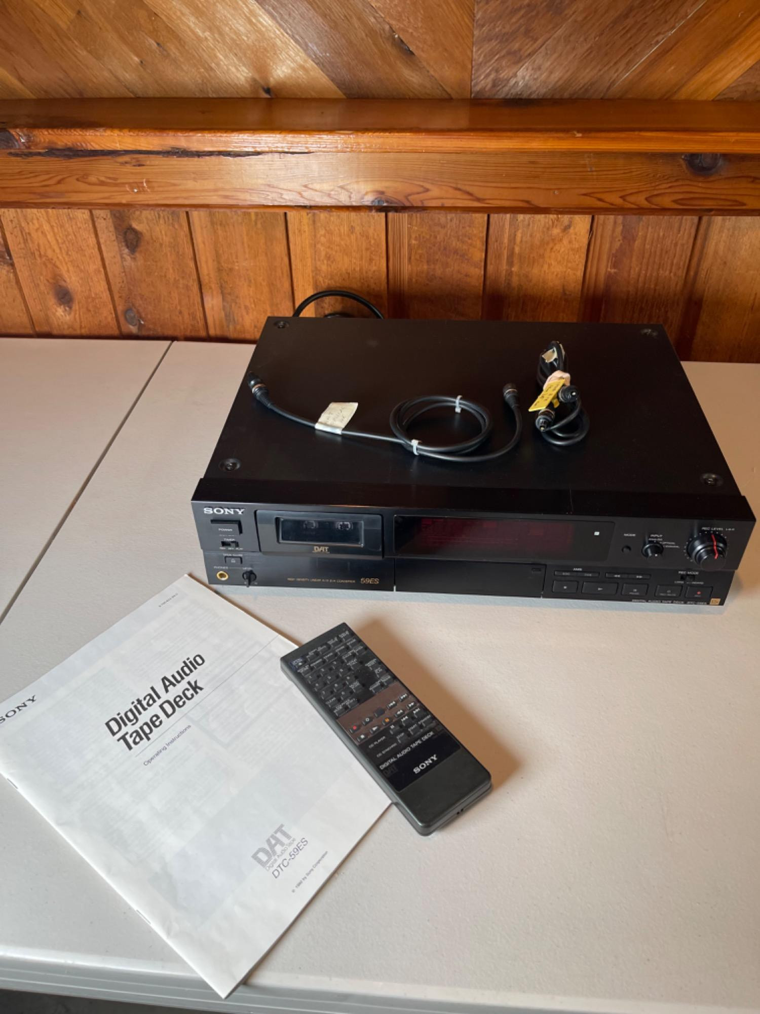 Vintage Sony Stereo Dat Deck 59ES. Sony DTC-59ES Digital Audio Tape deck incl DAT tapesThe Sony DTC-59ES is a digital audio tape deck that belongs to Sony's DAT (Digital Audio Tape) product line. DAT technology was introduced in the late 1980s and 1990s as a high-quality method of digital audio recording and reproduction. The DTC-59ES was one of the models that epitomized the DAT revolution, and it is still prized by audiophiles and enthusiasts for its sound quality and durability.Important features of the Sony DTC-59ES and the DAT technology:Digital Audio Quality: DAT was intended to be a step up in terms of audio quality over analog cassette tapes. It used a 16-bit linear PCM (Pulse Code Modulation) recording format, similar to audio CDs, providing high sound quality without the lossy quality often associated with analog tapes. 17L x 4T