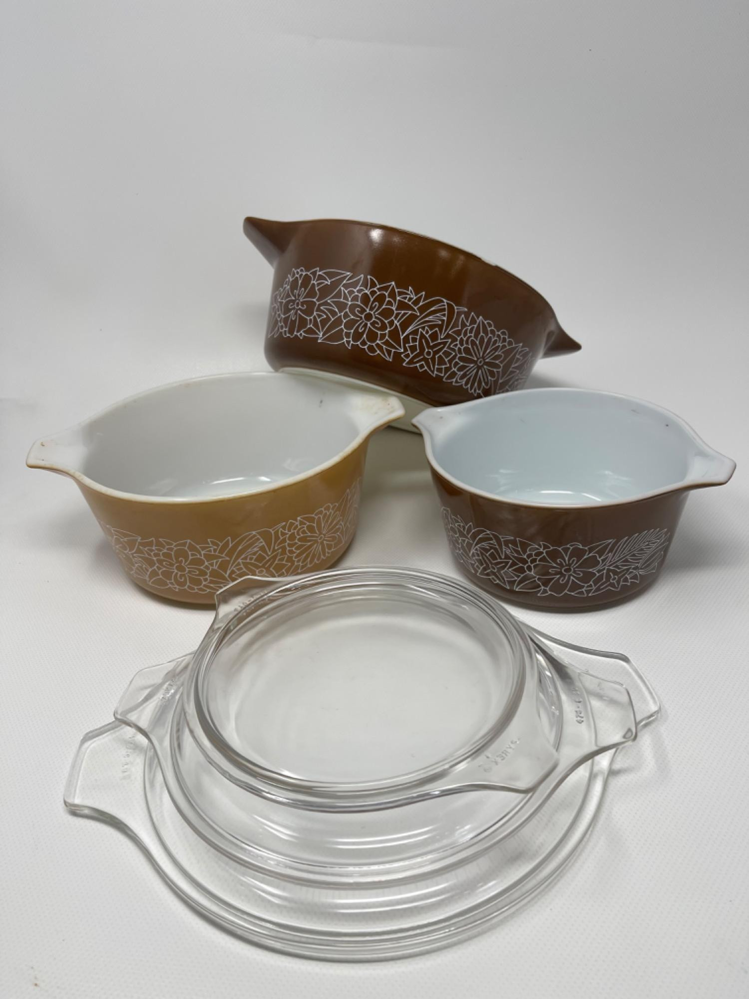 Woodland Nesting Pyrex Casserole Baking Dishes With Glass Lids. Dark brown medium bowl has small chip on upper lip.