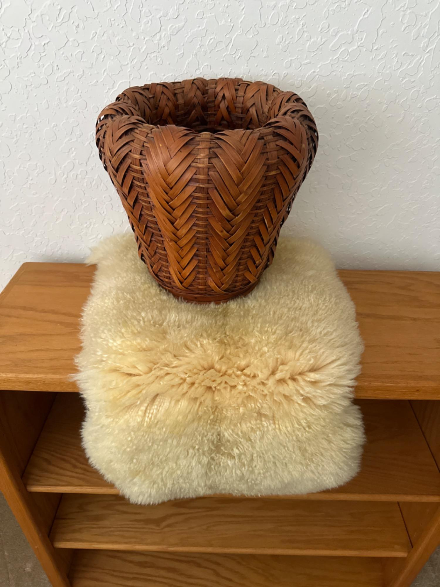 A hand woven basket and sheep skin rug. Woven basket is 12 inches high by 11 1/4 inch wide. Sheep skin is 67 1/2 inches long by 22 1/2 inches at its midpoint the sheepskin would look great thrown over a mid-century chair.