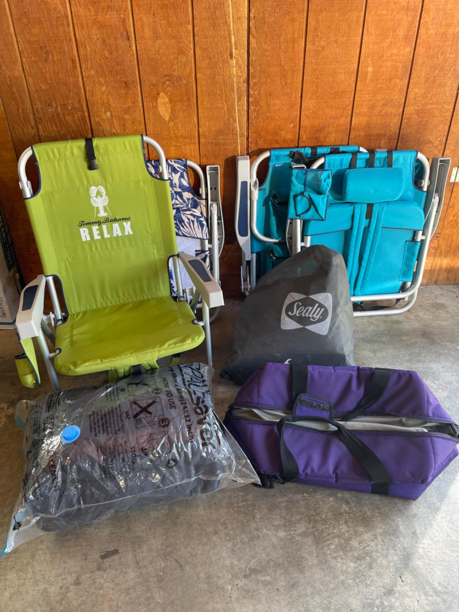 Folding Beach Chairs, Queen Size Inflatable Mattress and Sleeping Bag. Purple duffle bag included. Sealy Blow up mattress bought at Costco.