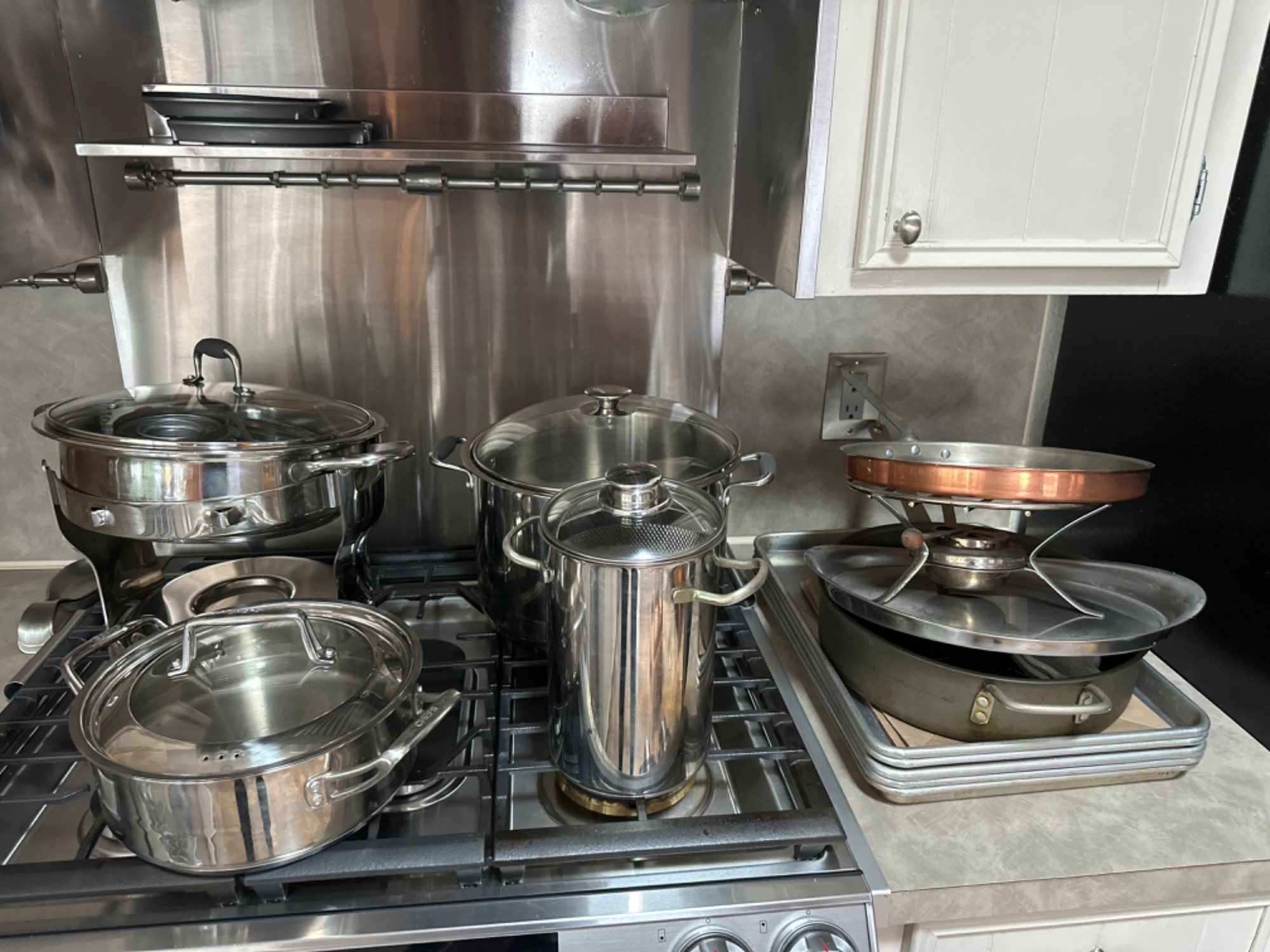 This is it assorted cookware. The largest is a 10 quart. There is cooking sheets and a copper pan with a Bunsen burner.