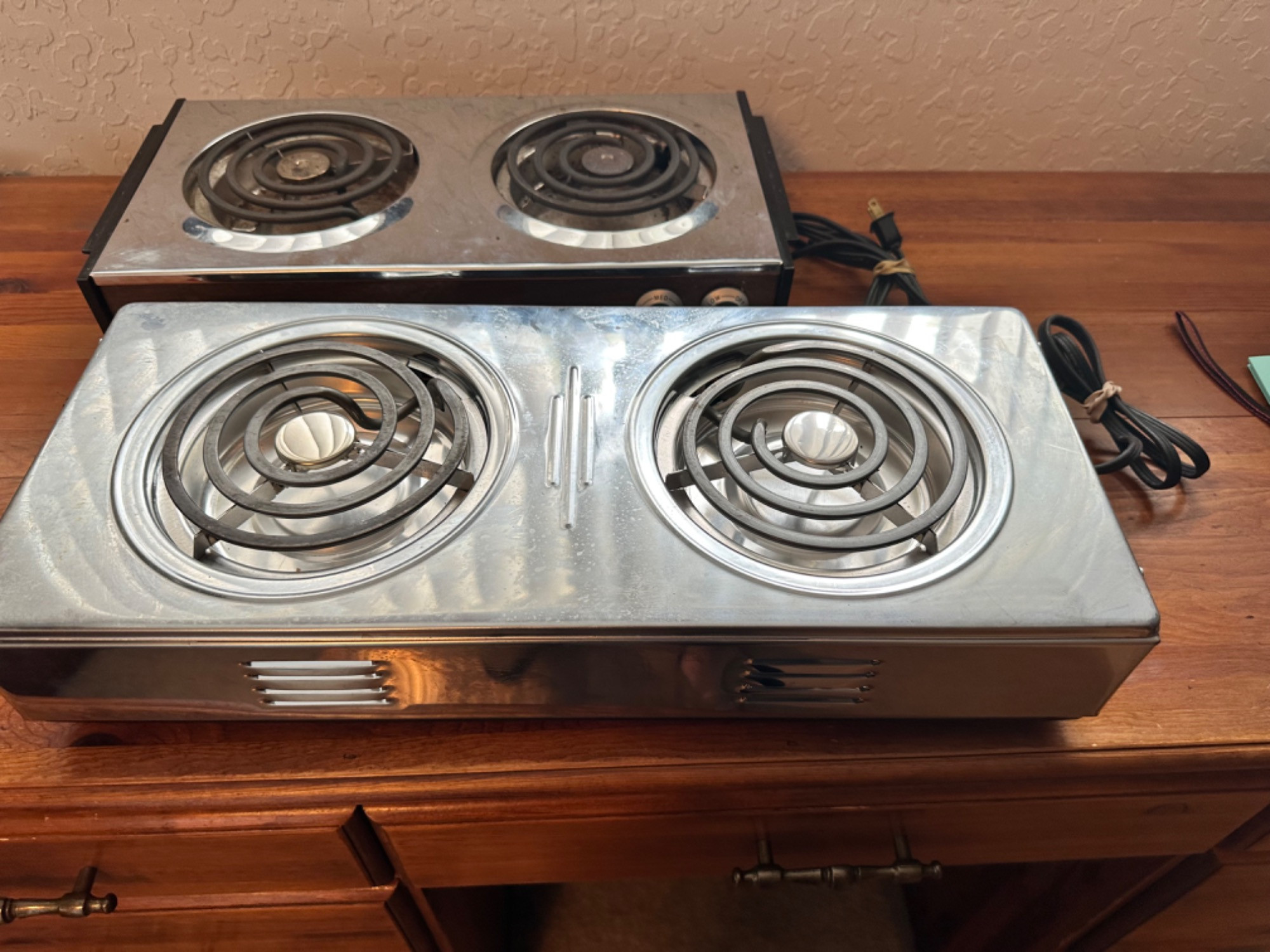 Two electric table top ranges, the larger one measures 20 inches across by 8 1/2 wide one measures 8 1/2 across by 9 inches wide. These are both plug-in. Great for extra space in the kitchen.