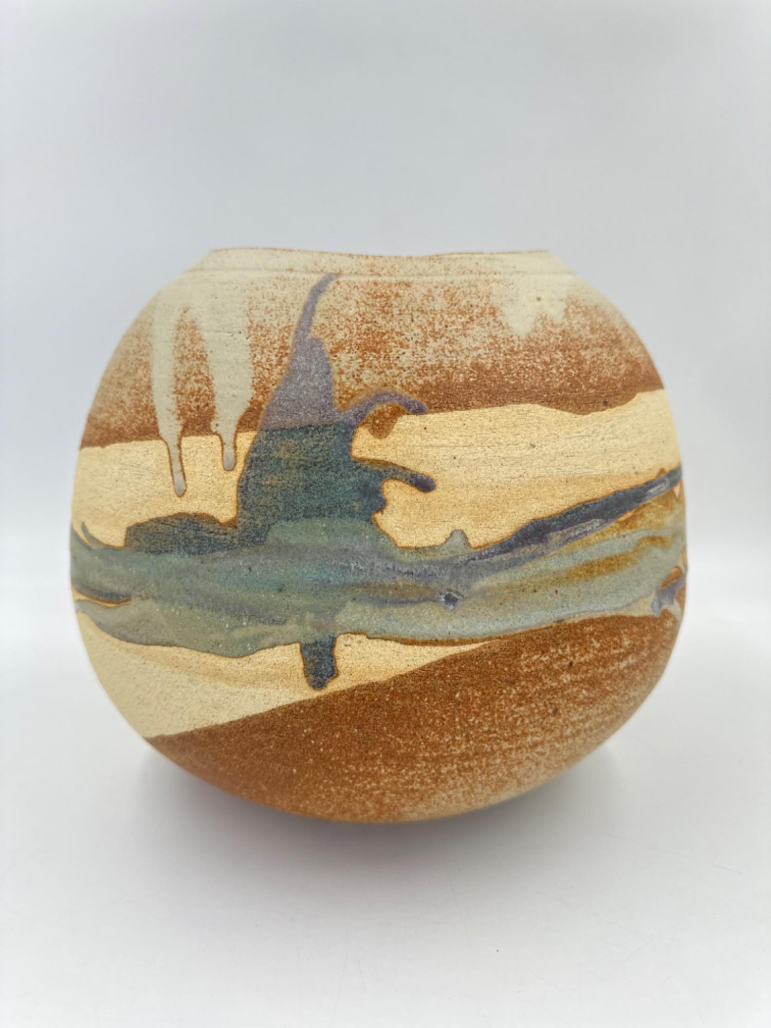 Signed Boho Scandi Vintage Studio Art Pottery Vessel - 9"T x 10"D Perfect condition "Nicholas Guerrero,71 of Sacramento CA,passed away December 23, 2009. Born in Wyoming,a proud US Marine from 1959 to 1964. He was an artist in many ways and his passion was his pottery. " https://www.legacy.com/us/obituaries/sacbee/name/nicholas-guerrero-obituary?id=8630711