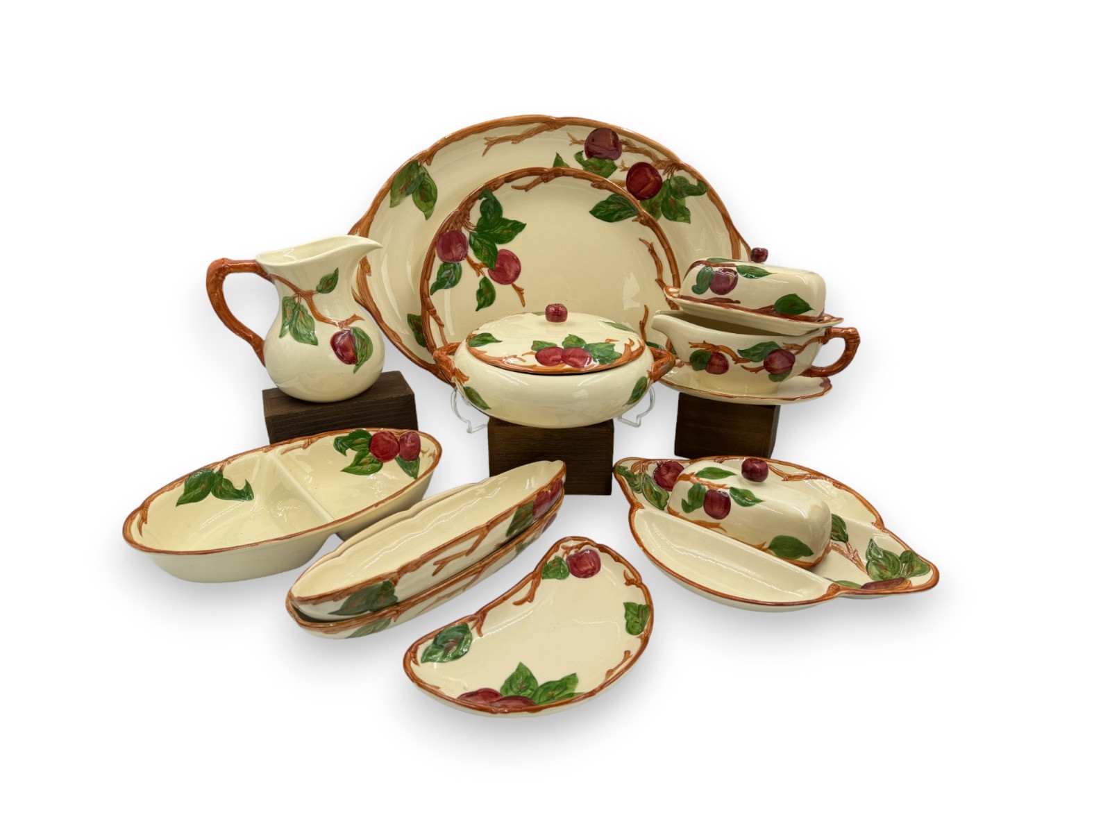 Vtg Franciscan Apple Earthenware - Round Covered Dish - Made in USA Handled tray - 19.5" handle to handle – has two flea bites of missing glaze 12.5" chop plate Round Covered Dish - handle to handle 10" Other noted flaws: extra butter dish cover has discoloration, butter dish base has chip, flea bite to pouring spout of gravy boat