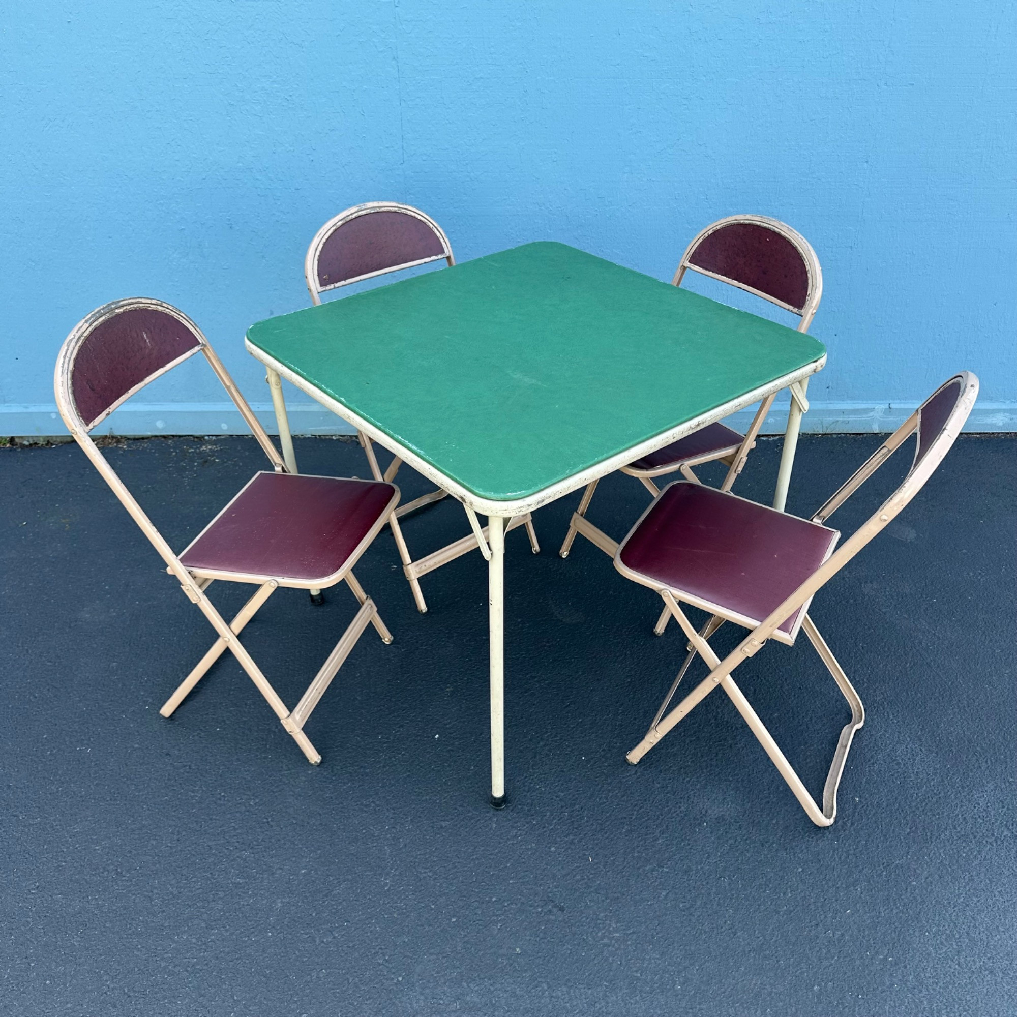 Mid Century The Durham Line Folding Maroon Chairs This chair set has a cool action where the bottom of the seat slides up towards the back Chairs have considerable wear to paint and tear on fabric to one Table has a small tear on top and the sides have sections where the paint is worn through to the metal Table measures 32"W x 28"T Surface is solid