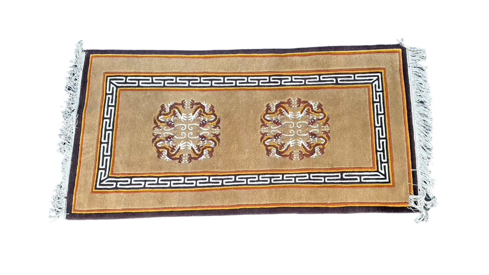 Hand Knotted Wool Tibetan Brown Dragon Rug Approx. 3' x 6' The label reads: YAK CHEMICAL DYED