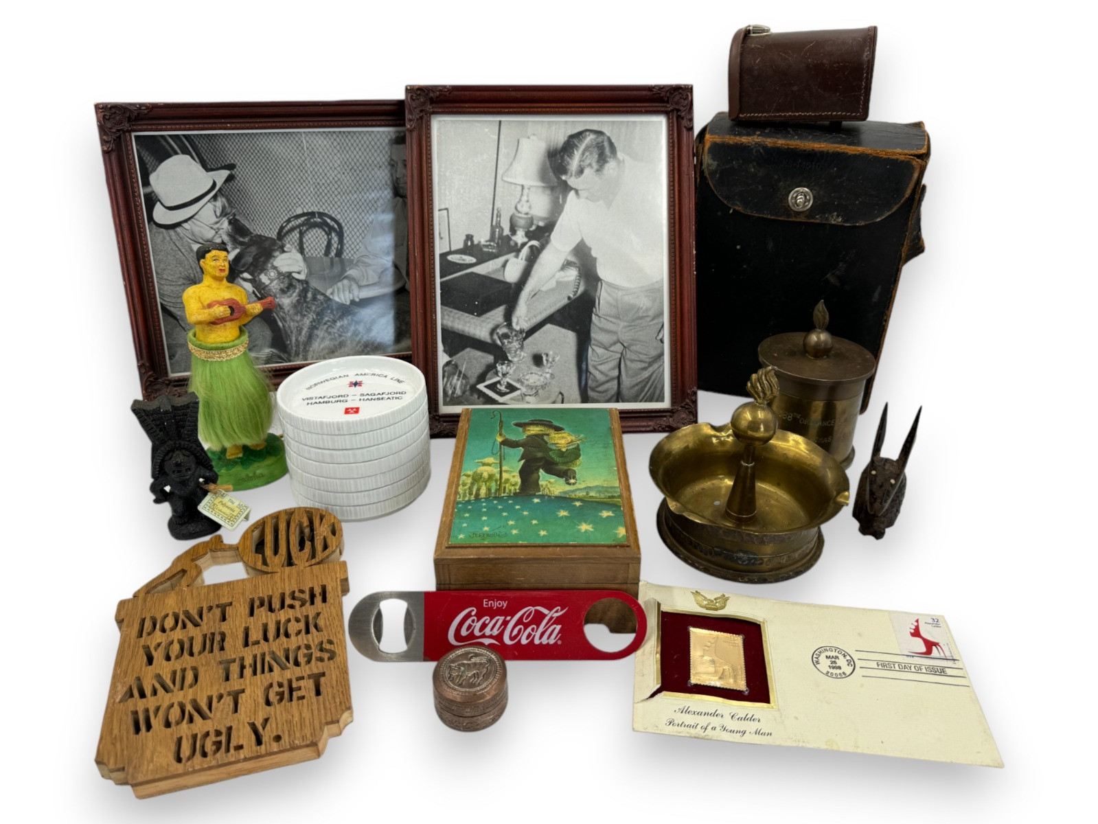 Vintage COOLectibles - Rosenthal Coasters, WWII Trench Ashtray + 7.5" 1958 Accoutrements China ceramic hula man Large leather case: 9.5"T Music box does not work