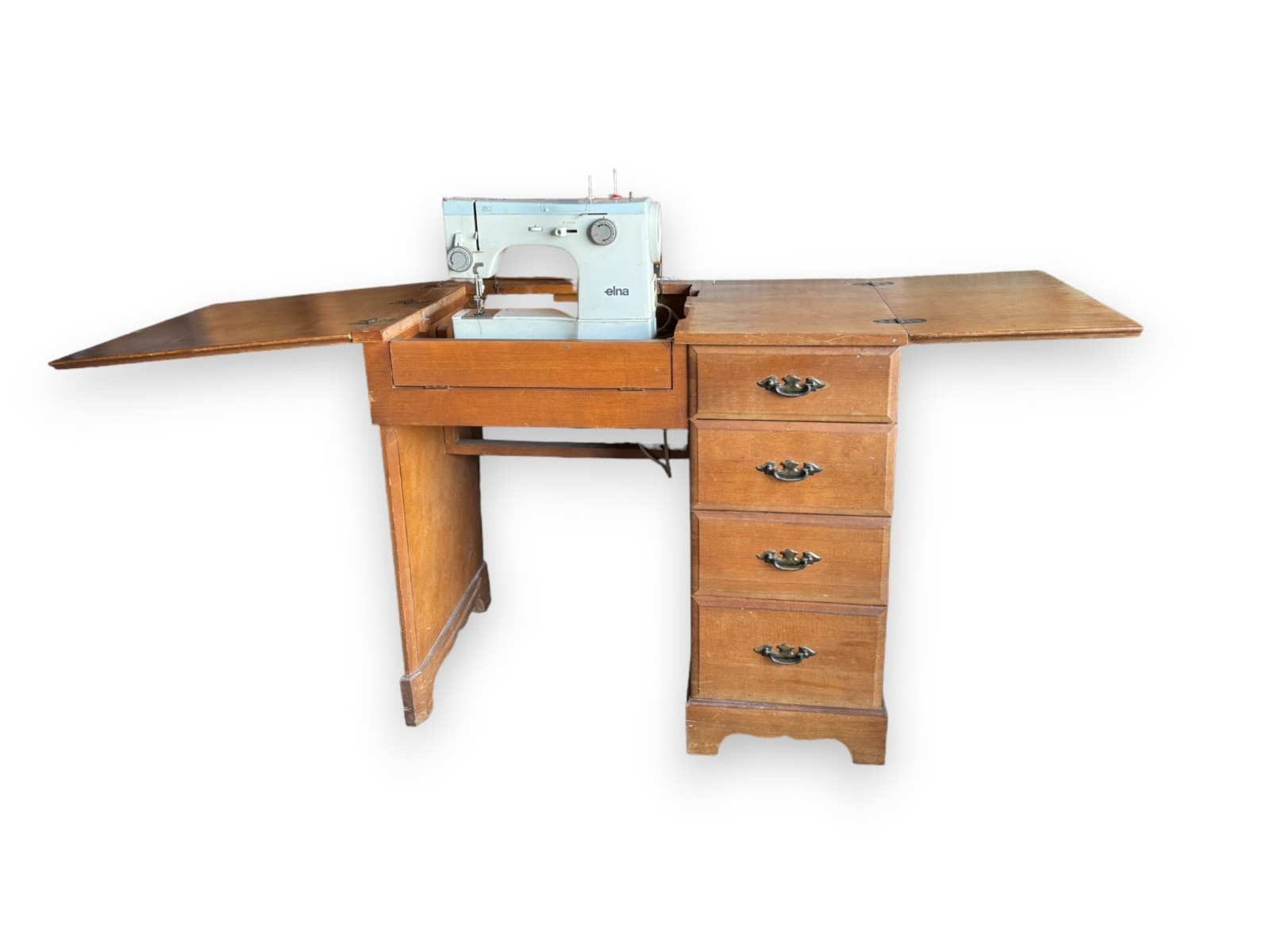 Vintage Singer Sewing Desk loaded with sewing notions. Has hideaway thread spool holder. Wear to all surfaces. Structurally sound. Measures: 34" x 19" x 30.5" when closed up Elna SU Sewing Machine - turns on. Needle bobs up and down.