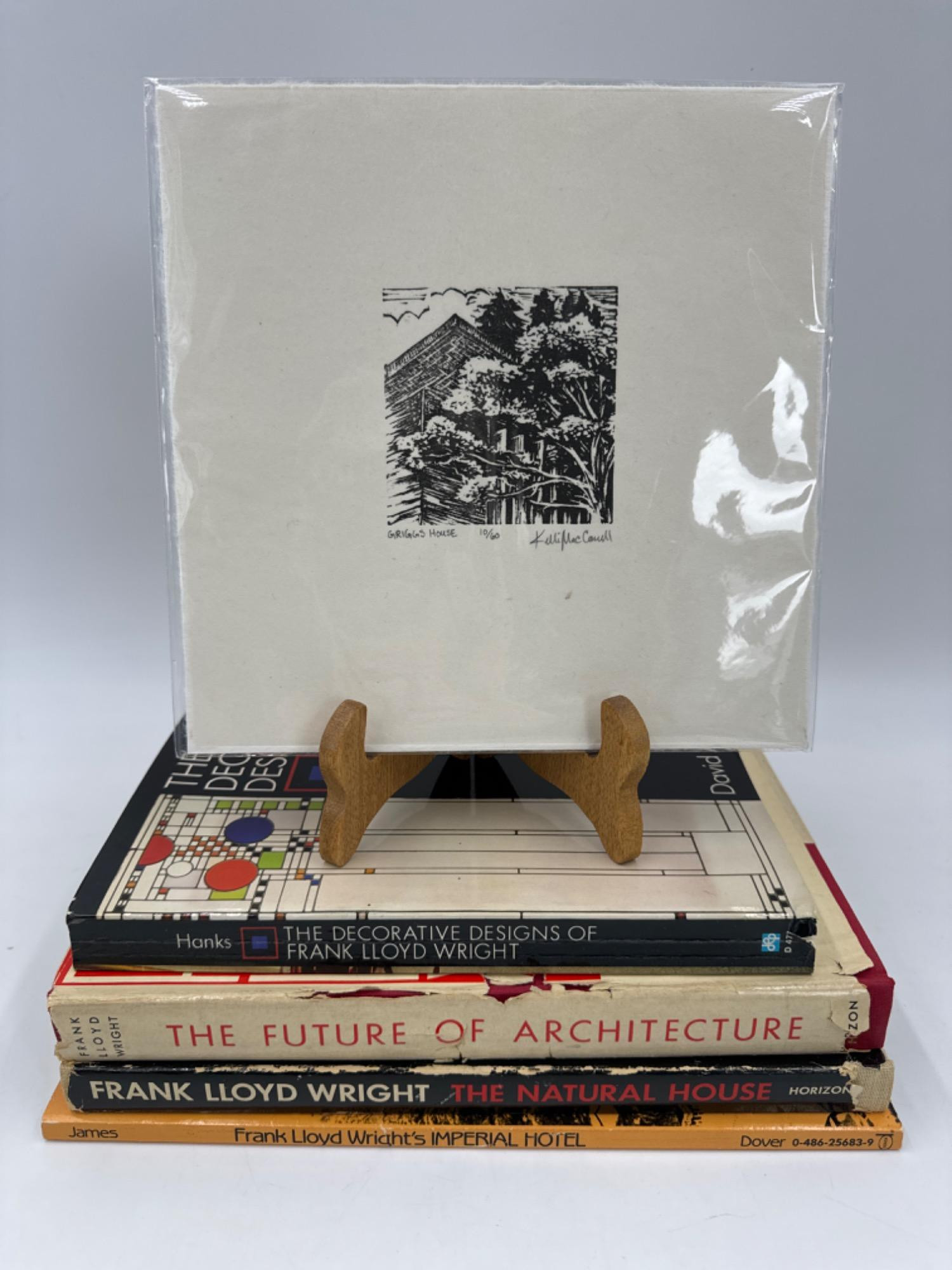 Limited Edition 2018 Kelli MacConnell Griggs house Linocut 10 of 60 Art 8.25" x 8.25" Local Olympia Artist - https://www.kellimacconnell.com/ 1979 David A. Hanks The decorative designs of Frank Lloyd Wright 1953 Frank Lloyd Wright The Future of Architecture 1954 Frank Lloyd Wright The Natural House 1968 Frank Lloyd Wright's Imperial Hotel by Cary James And other paper ephemera