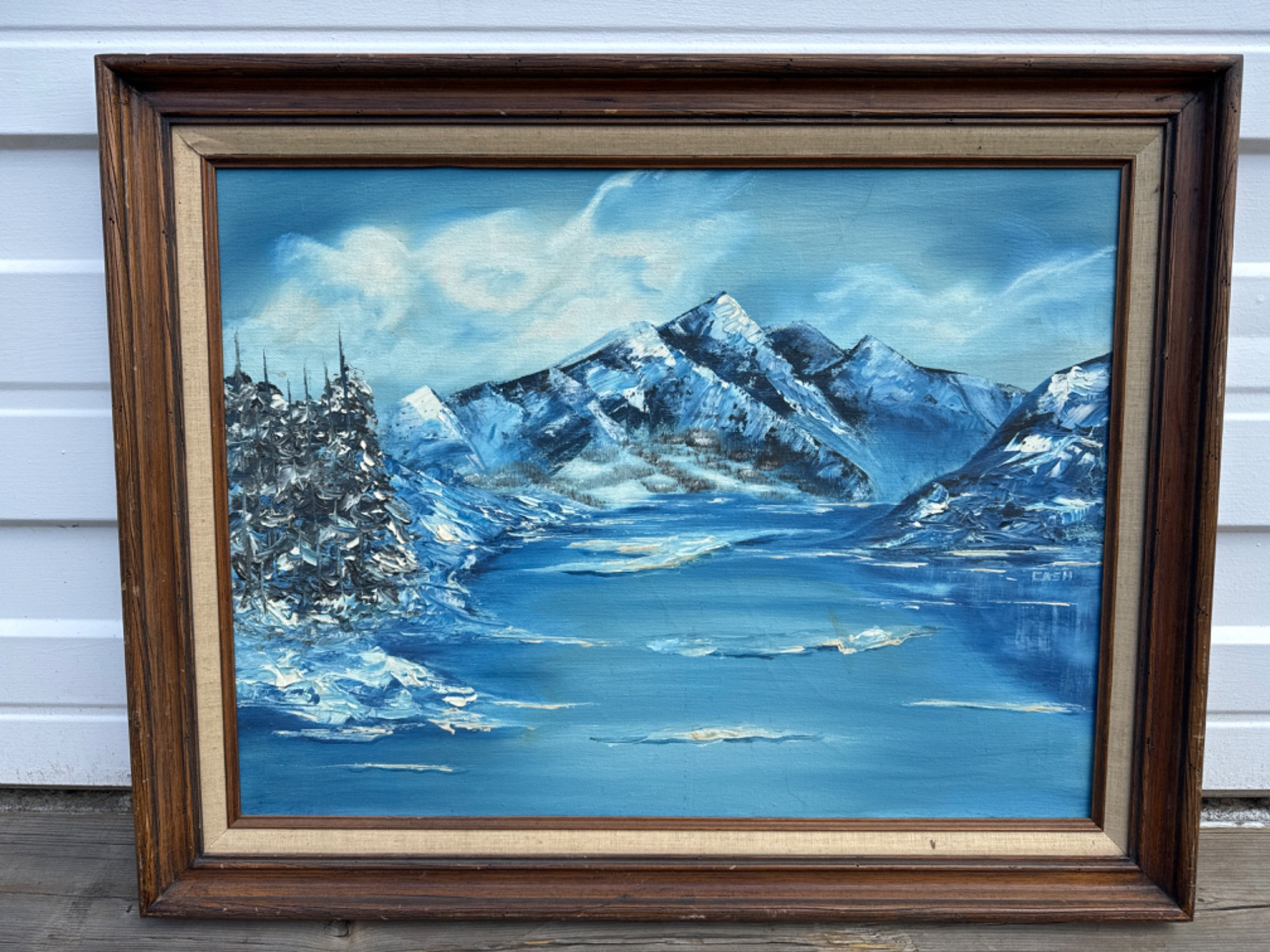 Original "Blue Majesty" Mountain Landscape Painting by John W. Cash Frame measures: 28.75 x 22.75" Has some brown spots - unsure if they can be removed Signed by artist