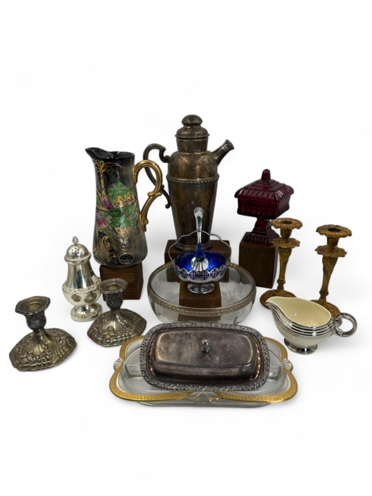 EAPG US Glass Sheraton Greek Key Pattern 1913 Berry Bowl 1940’s Taylor Smith Art Deco Platinum band creamer - 2.75"T Rustic candle holders. Silverplate pitcher 11.5"T, shakers, butter dish, and candlestick holders Seattle Mar Viv Co hand-painted pitcher - 9.25"T x 4.5"D base