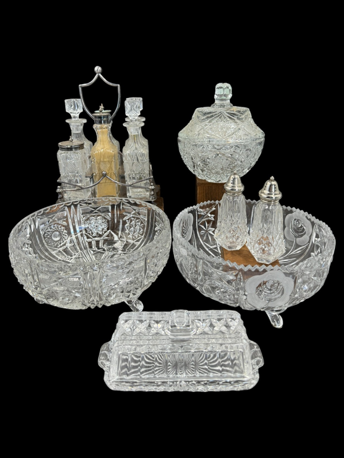 Brilliant Cut & Pressed Crystal & Glass Brilliant Cut Cruet Stand - beautiful condition Both bowls have a 9"D Brilliant Cut lidded dish - 7"T Only noted glass/crystal issue - chip to the butter dish base