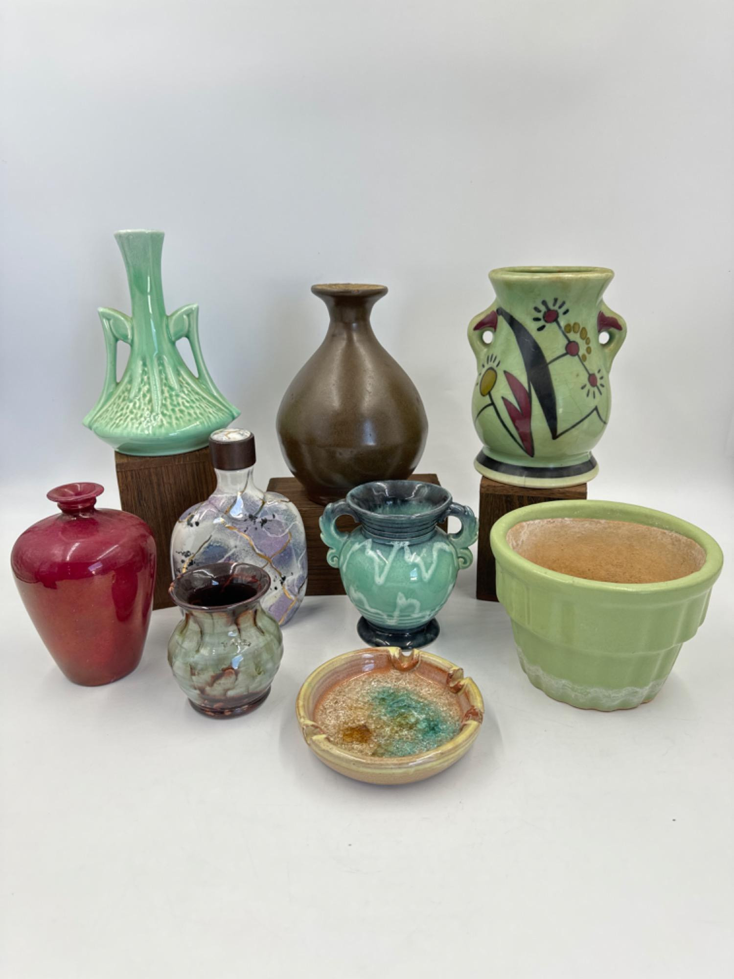 Stoneware and glass ashtray by Hunt 4.5" CA Pottery vase 589 11 has chip on rim Hand Painted German porcelain flask - 6.25"T and 4"W Red antique pottery vessel Antique Earthenware Ceramic Jug - Possibly Tiger Whiskey Bottle - 7"T Pioneer USA vase - 6.5" Unique Green handled vase - 6"T