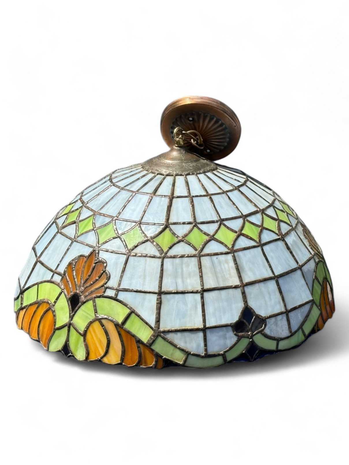 White, Green & Orange Tiffany Style Pendant Lamp 20"D Dome shaped pendant lamp has bronze colored leading and is approximately 20" across and 12" to the finial Swag chain, mounting plate and lamp holder included