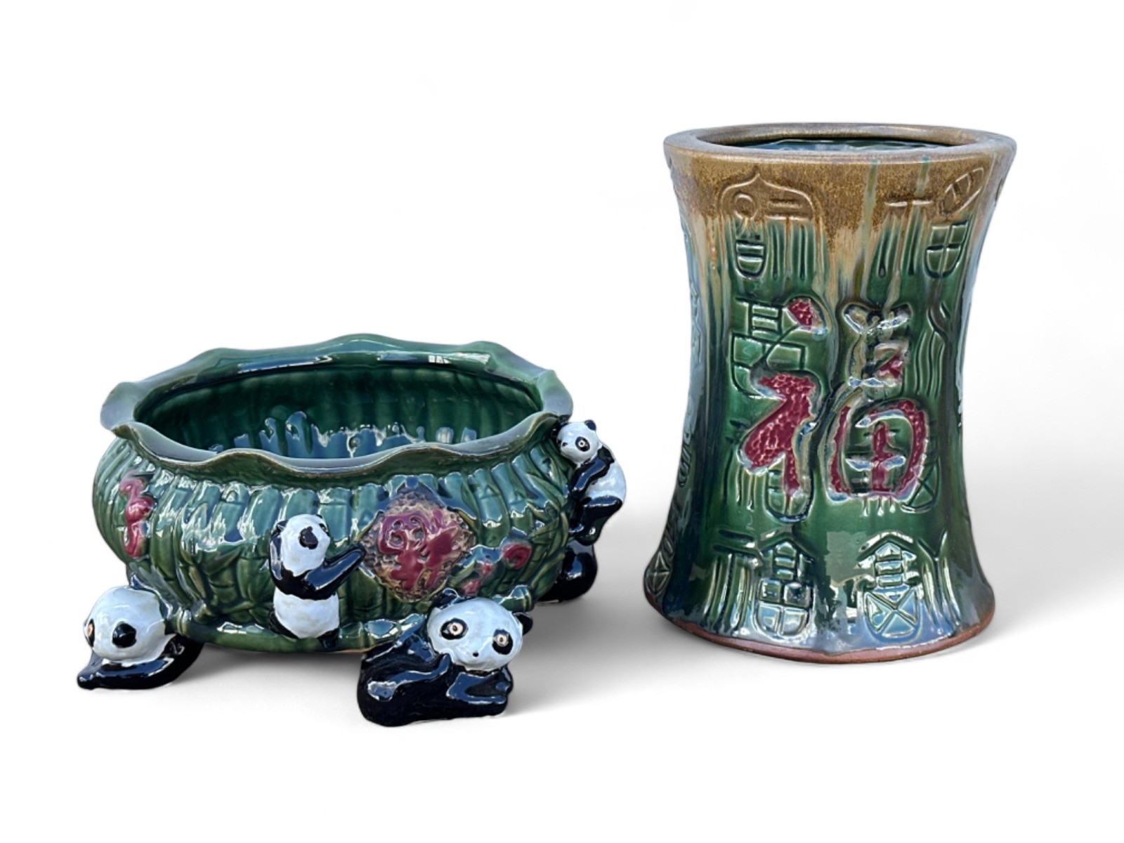 Vintage Massive FF Fishermen's Fortune Ceramic Planter + Asian Motif Vase FF Bamboo & Pandas bowl - 13"D x 6"T - Panda's look mildly terrified Vase is unmarked - stands 11.25"T x 8.75"D Both in excellent condition