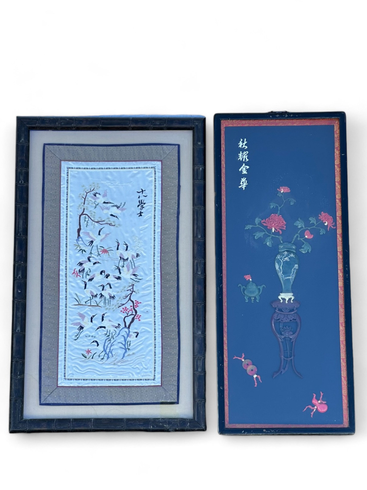 Lot # 145 - Vtg Chinese Silk Crane Embroidery + Black Lacquer & Stone? Wall Panel