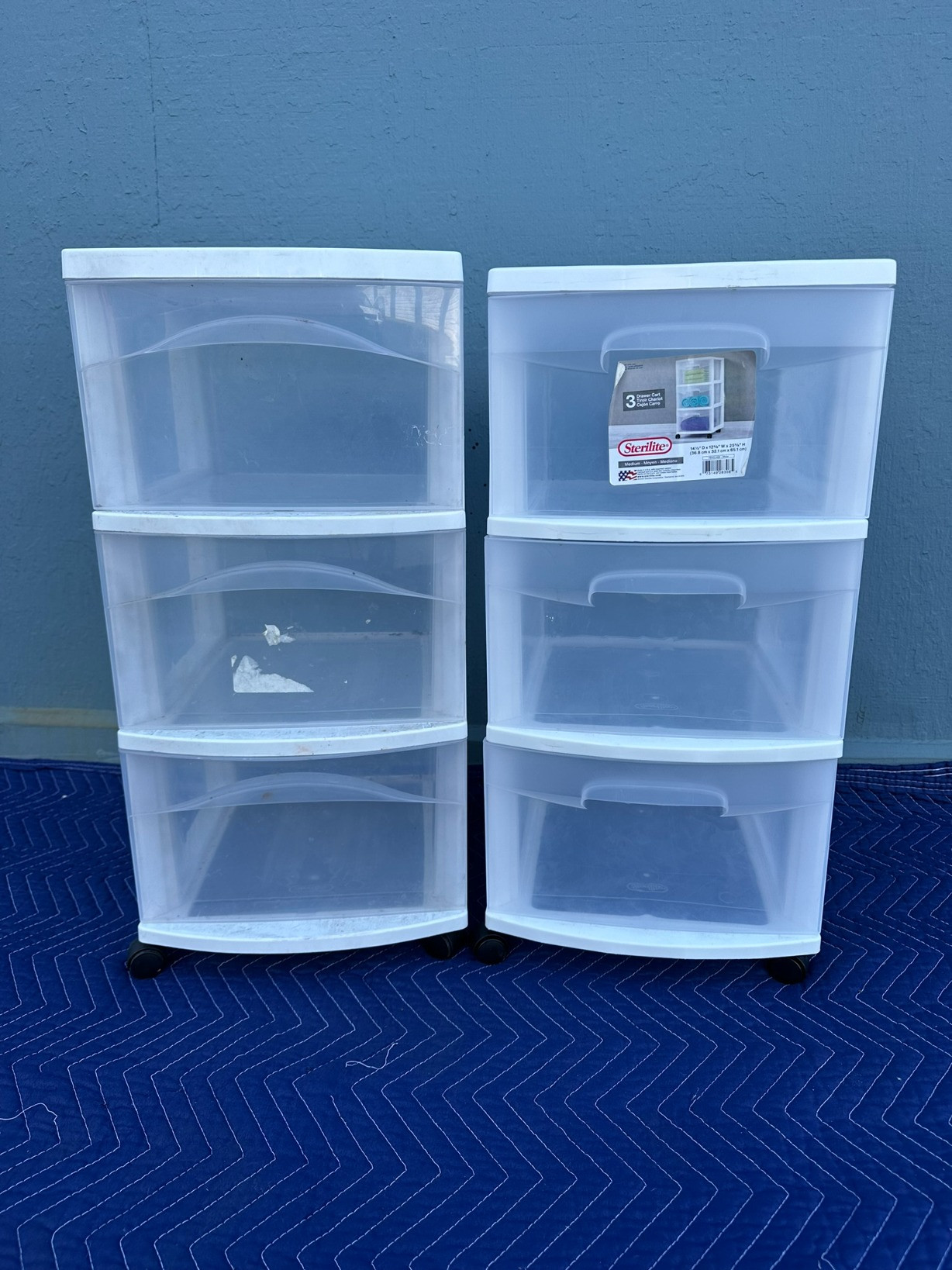 (2) Three drawer Sterilite Medium Rolling Drawers Compare new at $16 each Small crack on the top section of one set