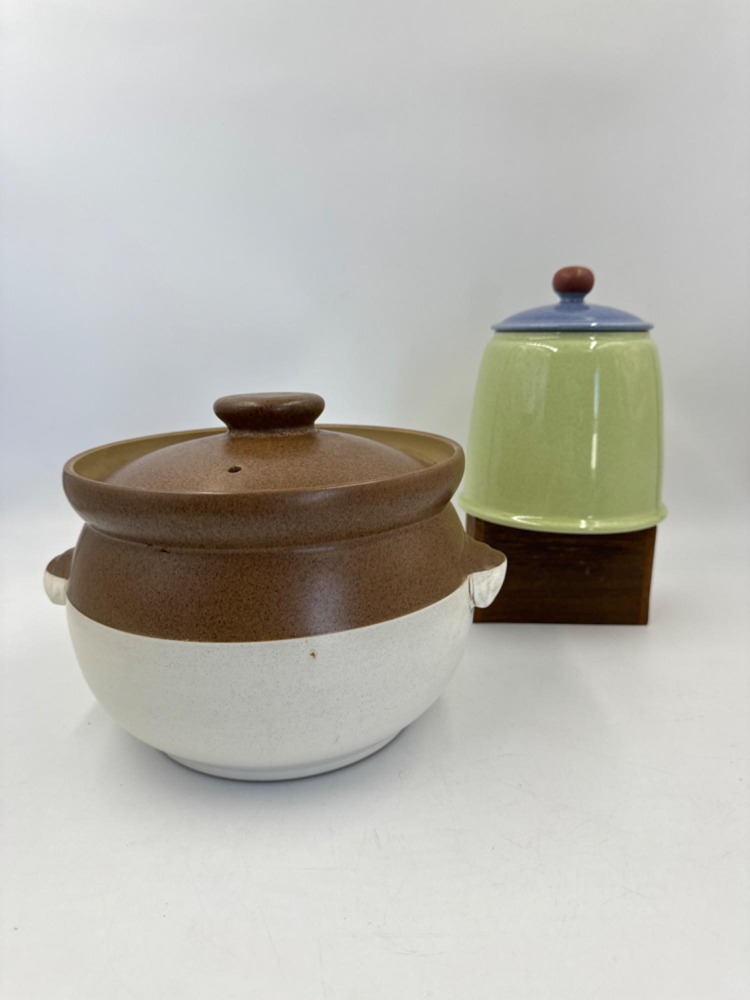 Vintage Denby Pottery Denby Potpourri - White & Brown Casserole Pot/Bean Pot Opening diameter of 8.25", 10" handle to handle .With lid approximately 7.75"T 'Juice' canister - 7.25"T x 4"D opening x 6"D base. Both items are an excellent condition.