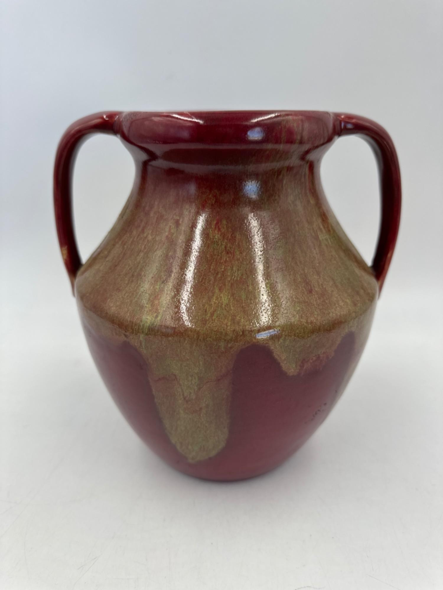 Vintage Antique Weller Pottery Handled Turkis Drip Glaze Vase Has mottled green and yellow glaze The width overall is approximately 8" and it stands 8.75" to brim EXCELLENT CONDITION