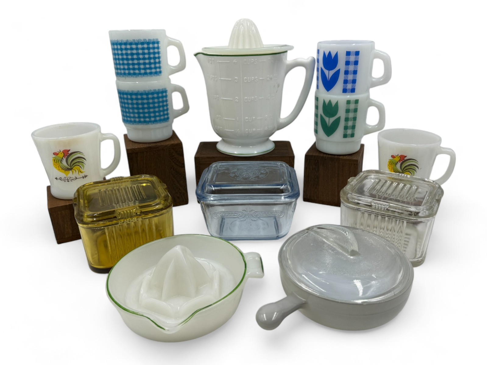 (2) Square Federal Glass fridgies - 4.25“ x 3.225“ tall Anchor Hocking Fire King Philbe Sapphire Blue - 5.25 x 4.5 x 3.5”T - some chips to the interior lid and rim (4) Fire King mugs (2) Termocrisa mugs Vintage Glasbake Small Casserole Dish w/ Shark Fin Lid Hazel Atlas reamer has chip to top that fits on top of 4 cup milk glass juicer measuring cup