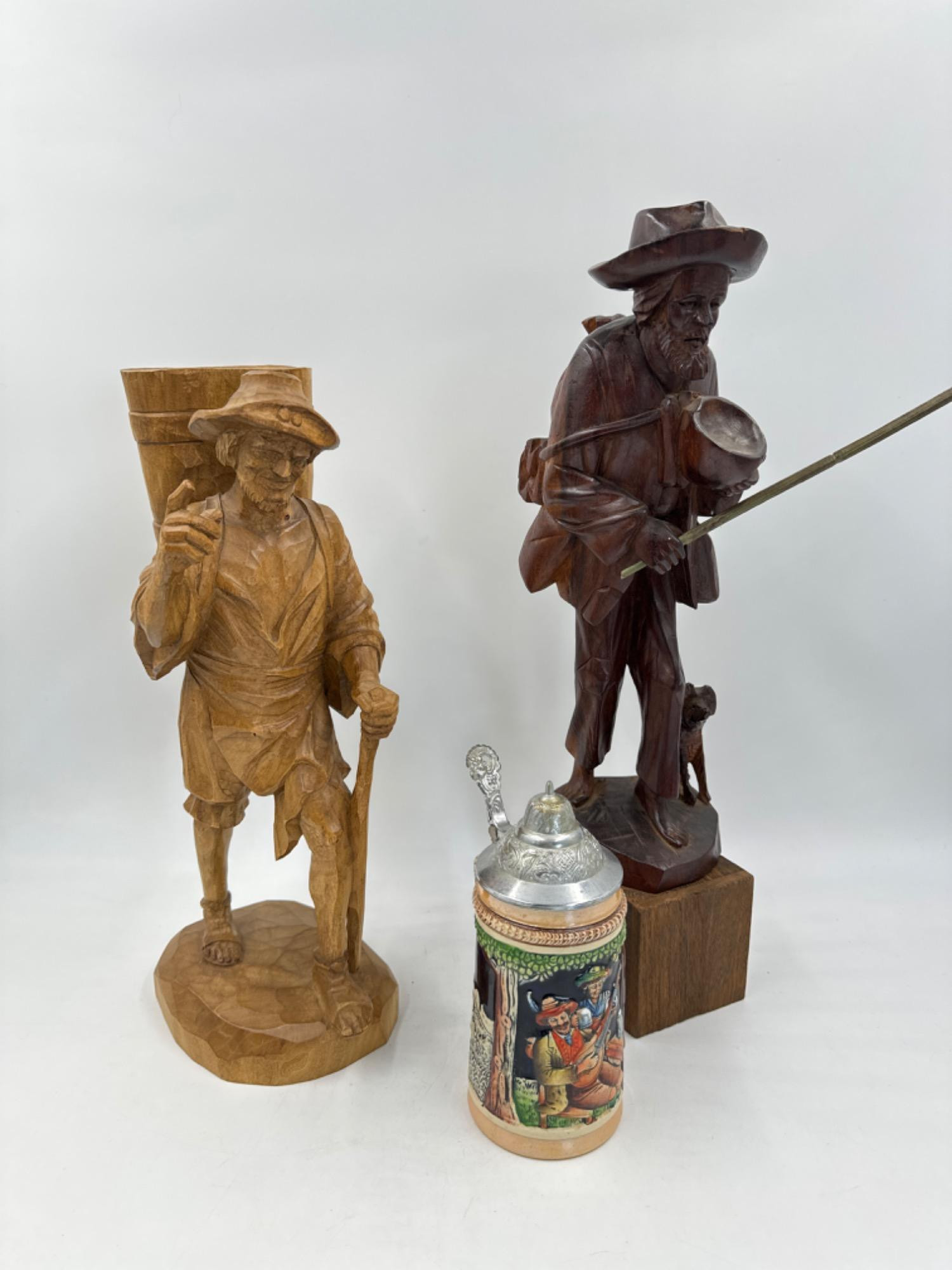 Lot # 180 - (2) Hand Carved Wood Male Walking Statues + Ceramic Beer Stein