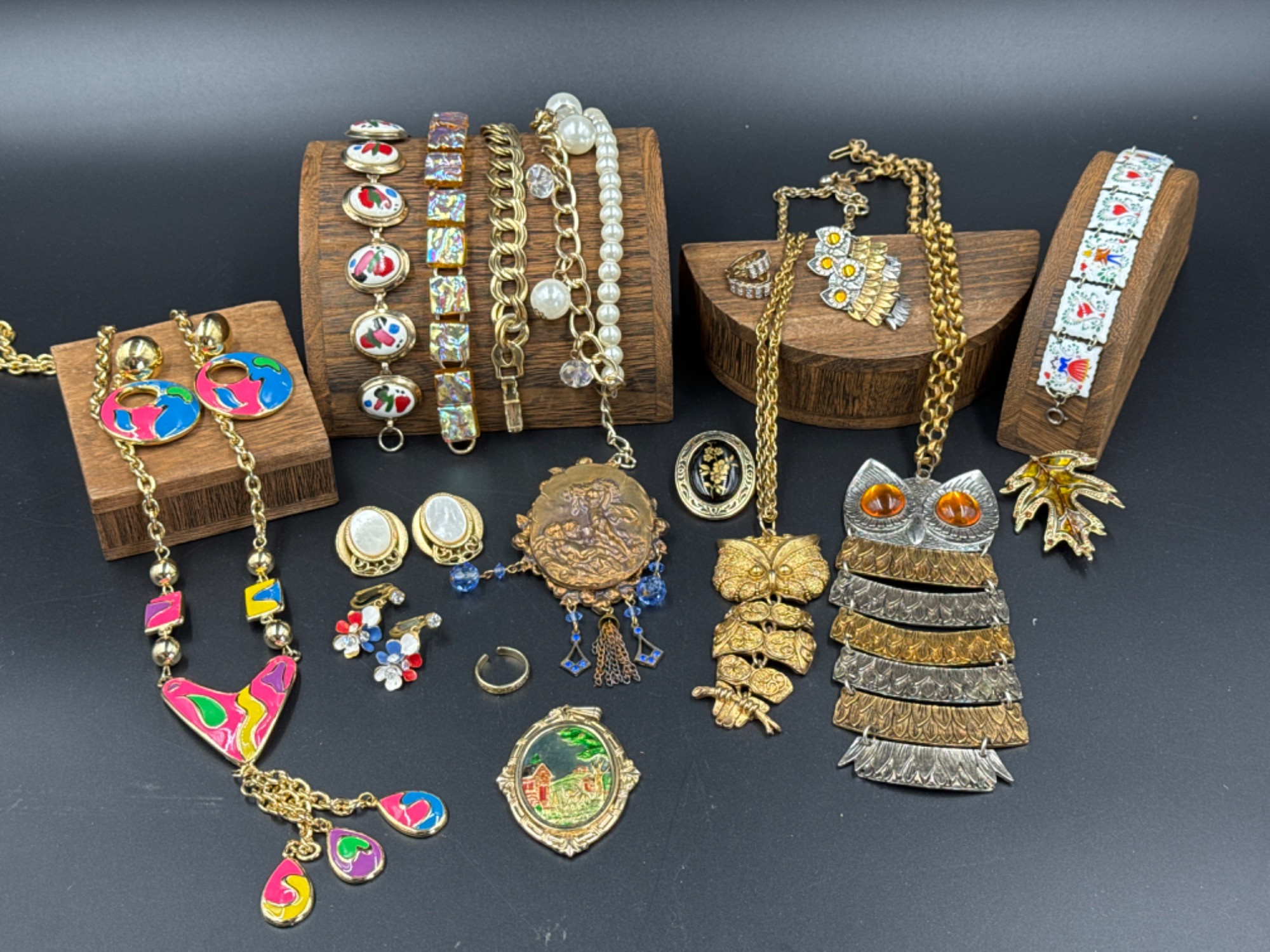 Vintage Costume Jewelry - Park Lane, 925, Enamel Panel Bracelet Park Lane owl statement necklace with clip on earrings - pendant is 5.5 inches long - wear to gold tone on chain Toe ring and earrings marked 925 - gold plated sterling silver Fuse glass bracelet needs one of the glass pieces glued back on 1970s Owl necklace marked J.J Red, blue, and white enameled metal earrings marked Austria on bag Leaf pin has broken/missing stem