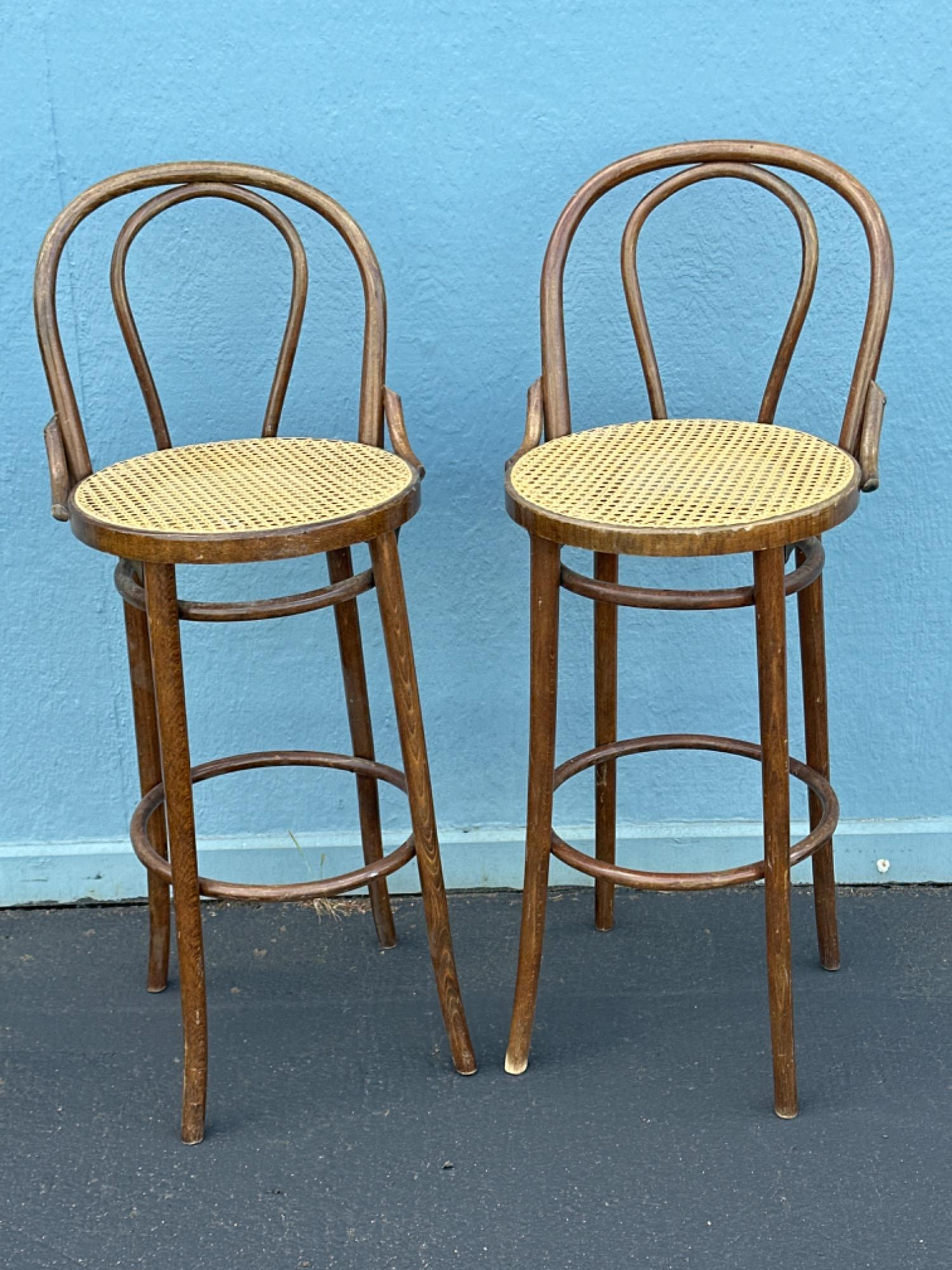 (2) Vintage Thonet Style Bentwood & Cane Bar Stools - 29.5" 17.5"W x 16.5"D; Seat height is 29.5", 42.75"T overall Has makers mark, unable to identify. Wear to legs at the base