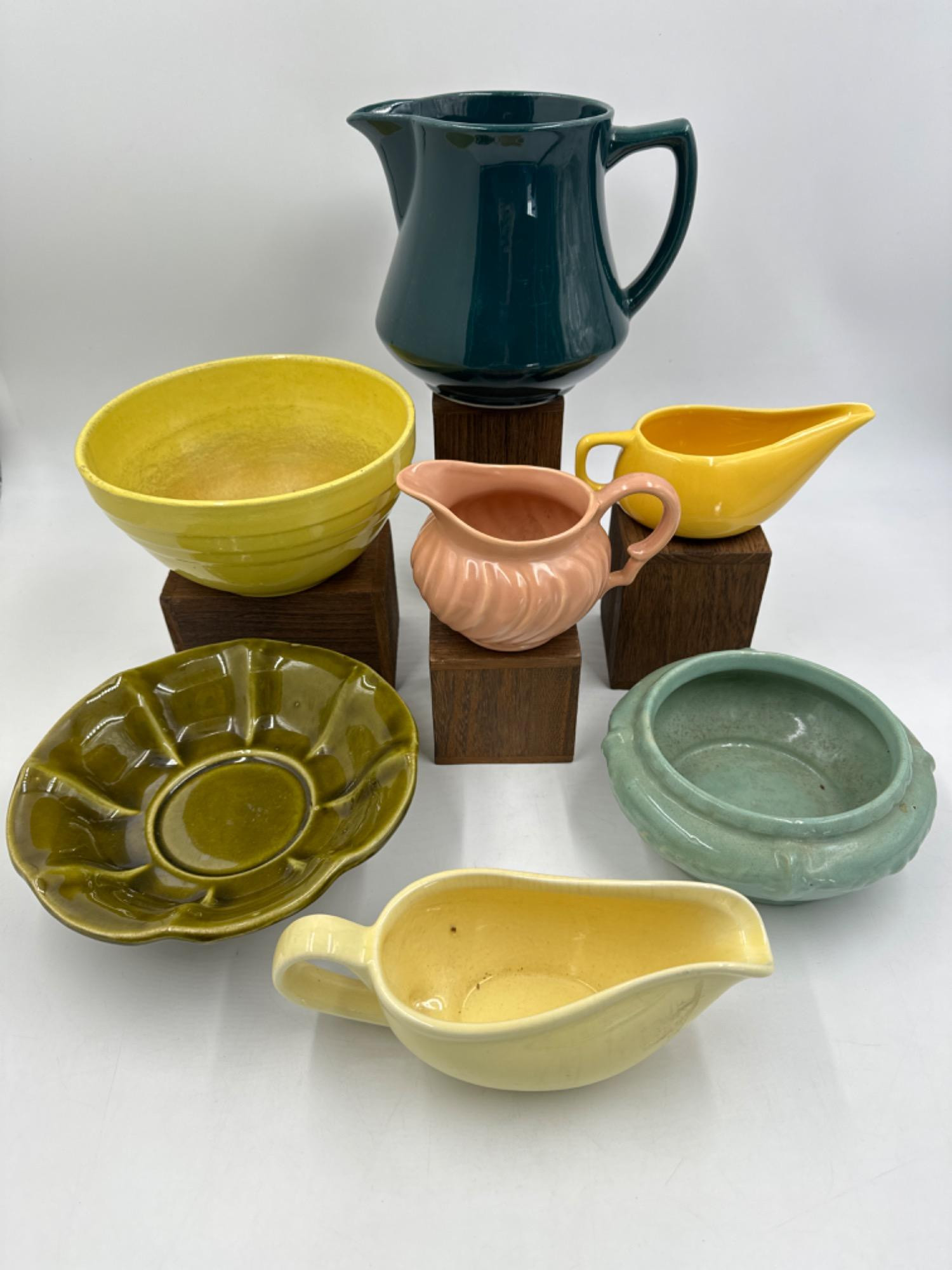 Evergreen/Blue Green Hall Pitcher - 5.75 tall 7.5 inches wide Well used yellow mixing bowl - 3.5 inches tall 7 inches diameter Olive green McCoy bowl - 7.5” D All are in good condition with no chips or cracks
