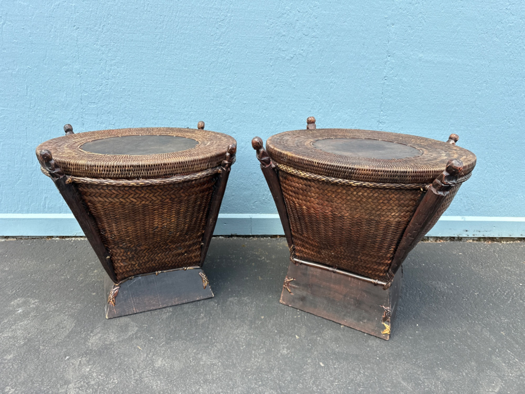 Woven Reed and Wood Basket Drum Side Tables - Tops Remove Both pieces are approximately 21”T x 23” Both in good condition with minor wear along the bases