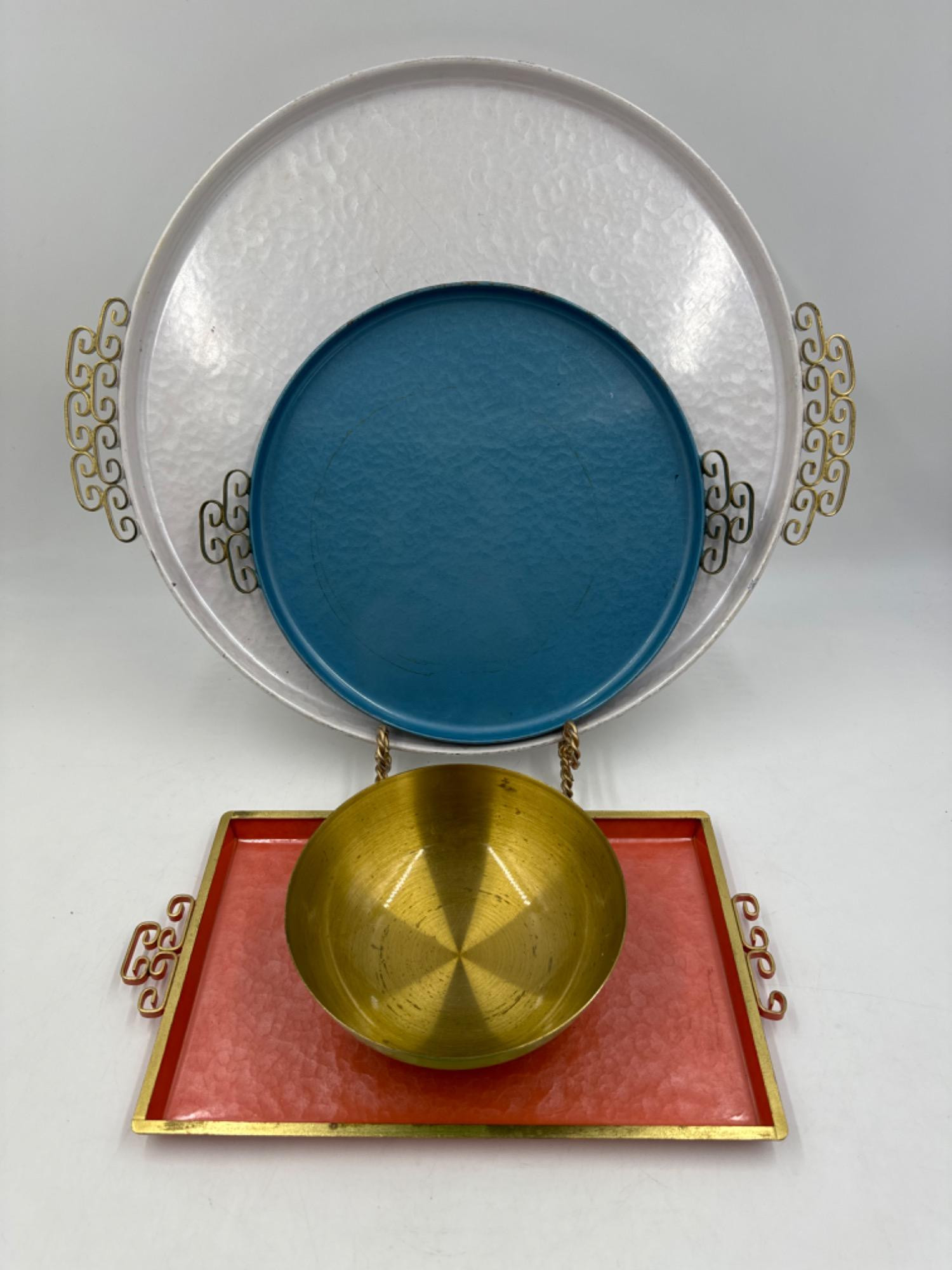 Mid Century Kyes Moire Glaze Hand Made Trays & Bowl Large platter is 17”W handle to handle - has utensil cuts Red tray is missing a detail piece on one side Green bowl is 6”D
