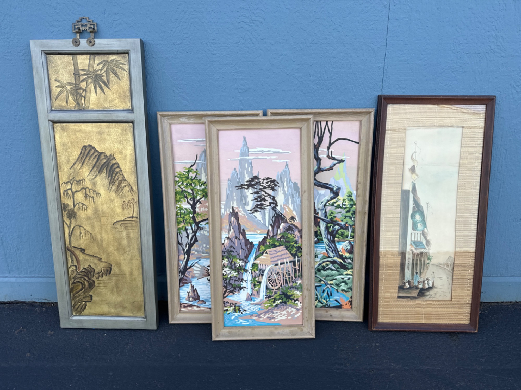 Largest double sided Japanese windscreen - 34x12" (3) Framed Paint by Number paintings - 26.25 x 12.25" Vintage Asian Watercolor Framed Art with Woven Matting 13" x 28" All frames have wear