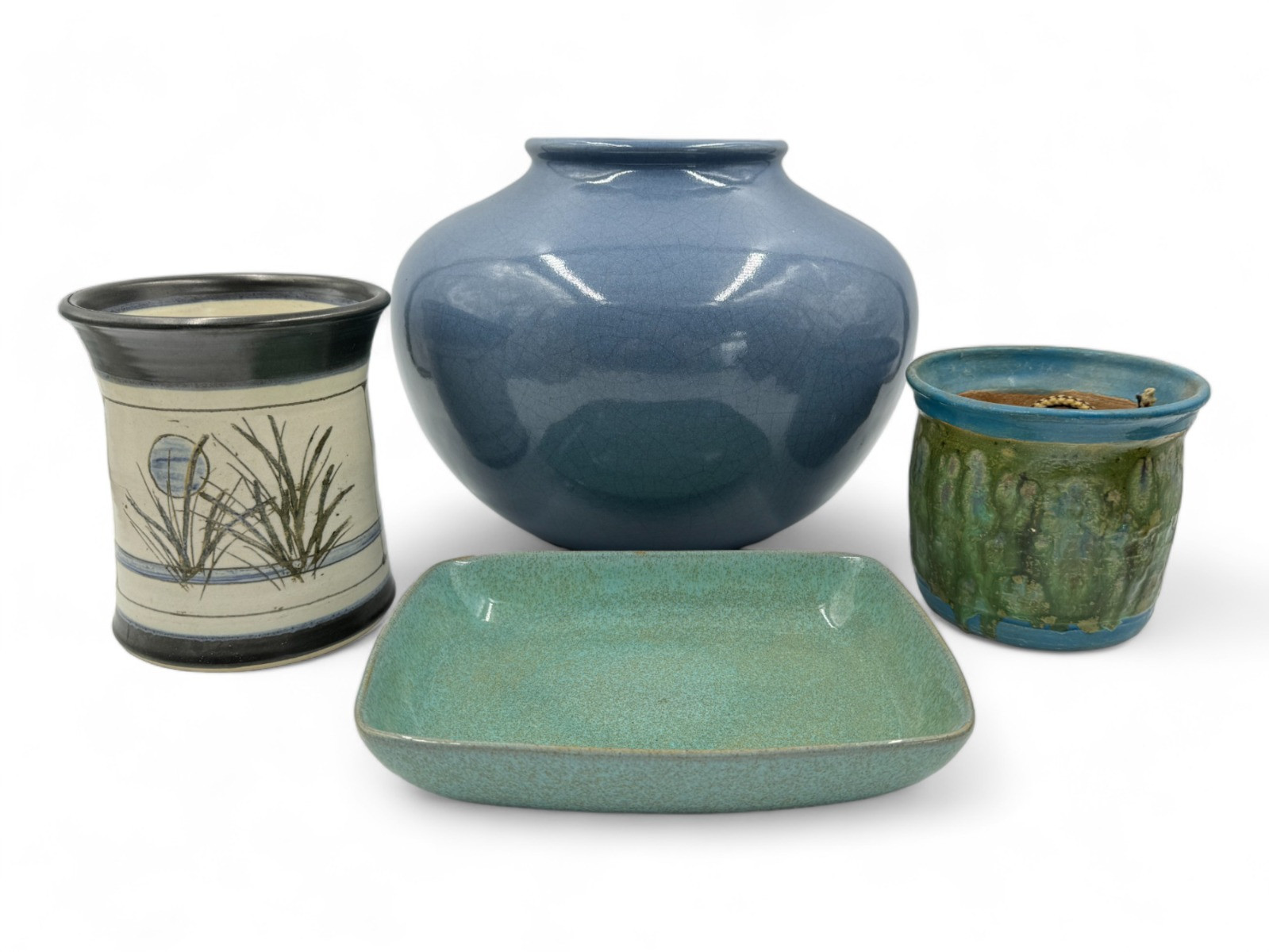 Vintage Blue Pottery - Glidden Tray - Hanging Drip Glaze Pot 1976 PB Drip glaze pot 5 x 5.5”D Stamped JD canister vessel 6 3/8”T x 5.5”D Large Vessel 9.5”T x approx 11”D Glidden 24 Tray 9x7"